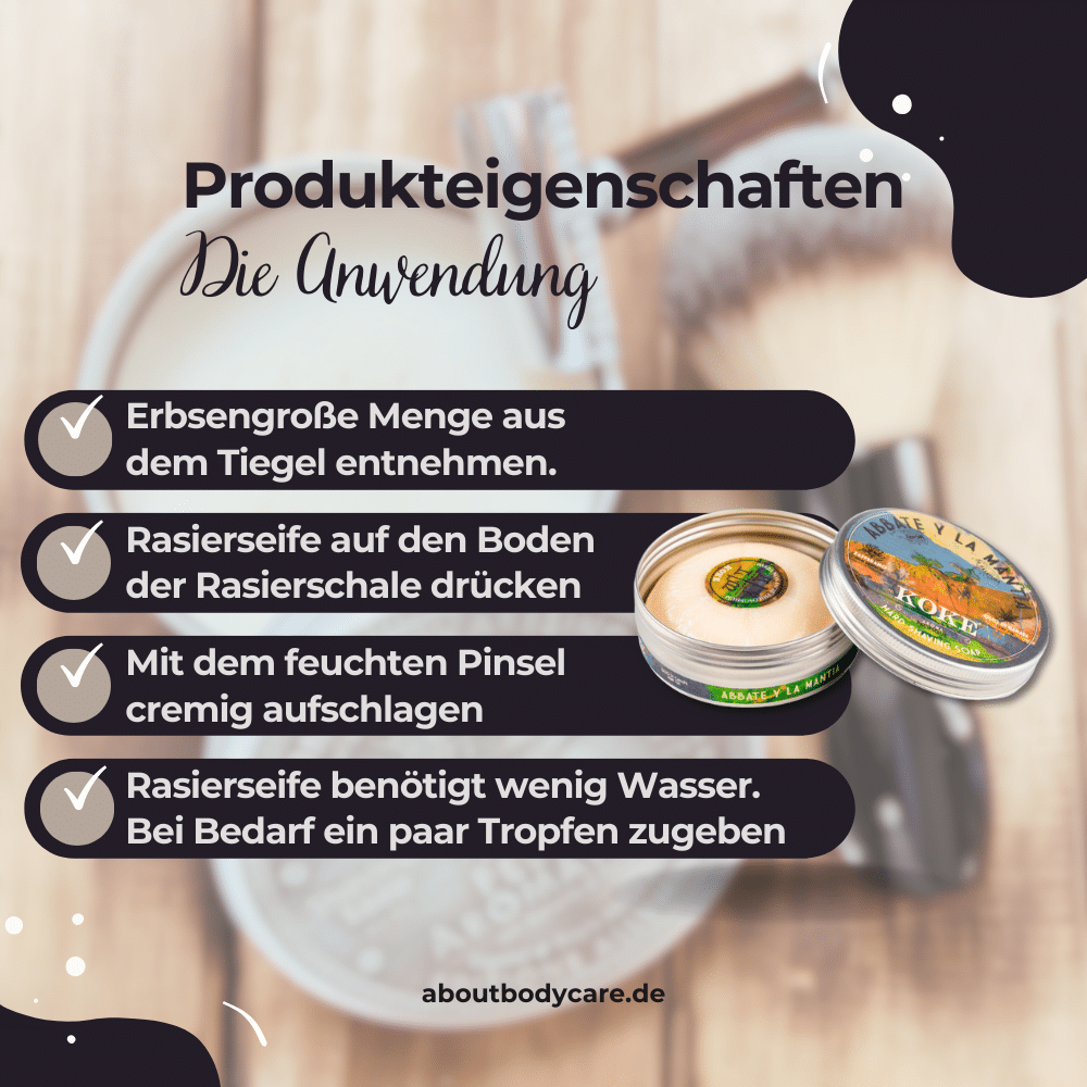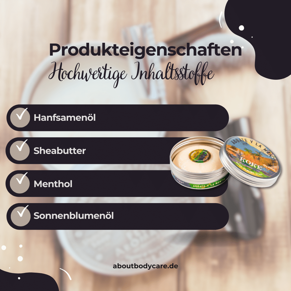 Natürliche Inhaltsstoffe: Hochwertige Rasierseifen bestehen oft aus natürlichen Ölen und Fetten, die während des Verseifungsprozesses entstehen. Diese Inhaltsstoffe können die Haut pflegen und mit Feuchtigkeit versorgen.