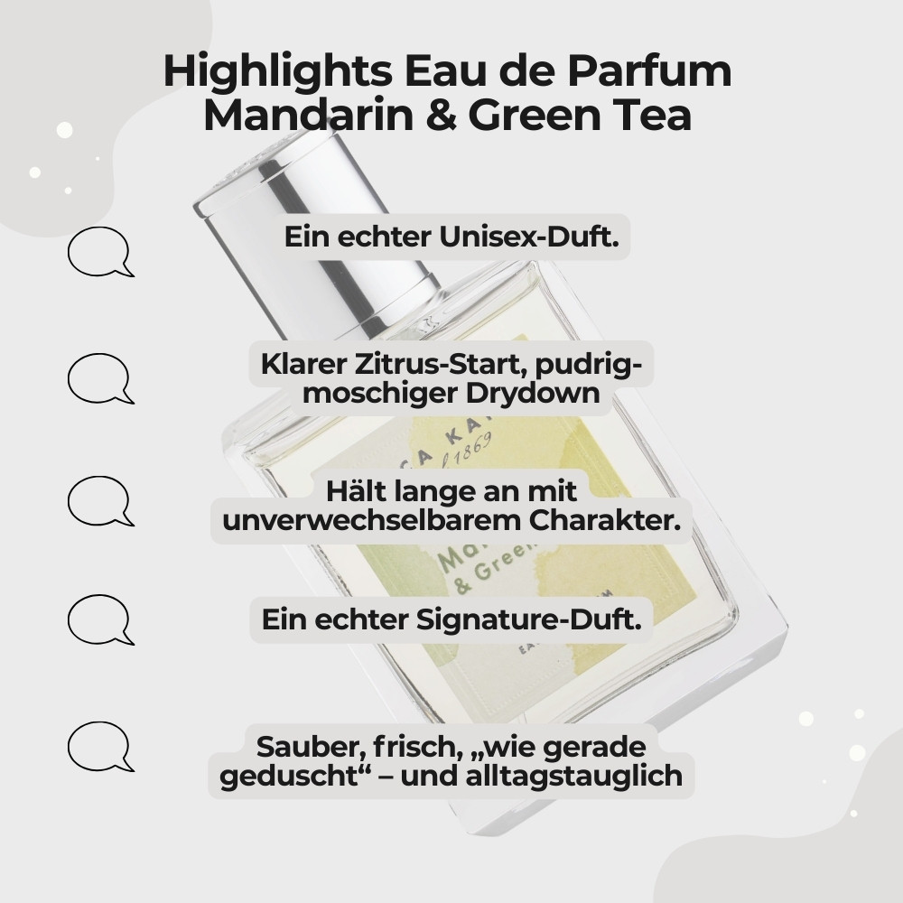 „Das Eau de Parfum Mandarin and Green Tea verbindet spritzige Mandarine mit klarem grünem Tee zu einem frischen Alltagsduft, der über Stunden wahrnehmbar bleibt und einen gepflegten, leichten Eindruck hinterlässt.“