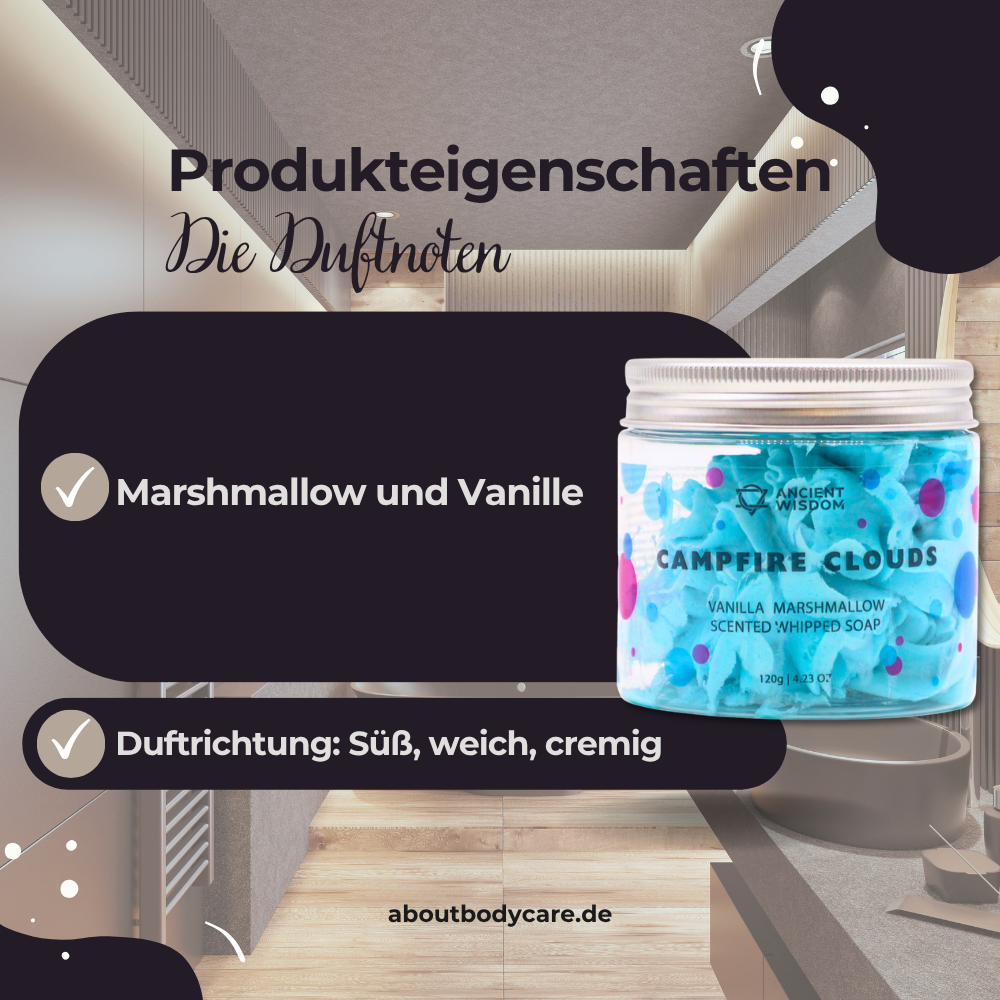 Die Schlagseife Campfire Clouds überzeugt durch ihren sanft-süßen Duft, die luftige Konsistenz und die liebevoll sowie detailreich abgestimmte Rezeptur. Wer nach einem Pflegeprodukt sucht, das mehr ist als nur Reinigung, findet hier eine wunderbar duftende Pause vom Alltag.