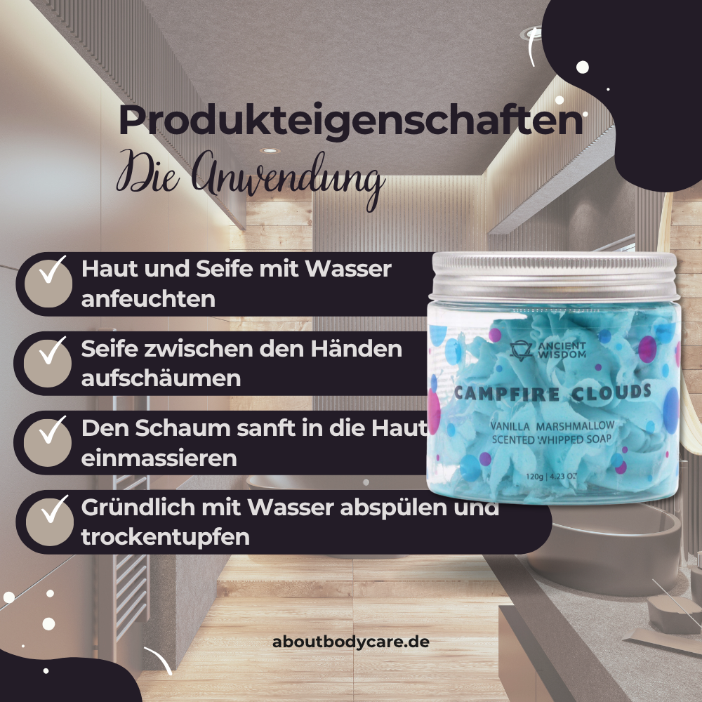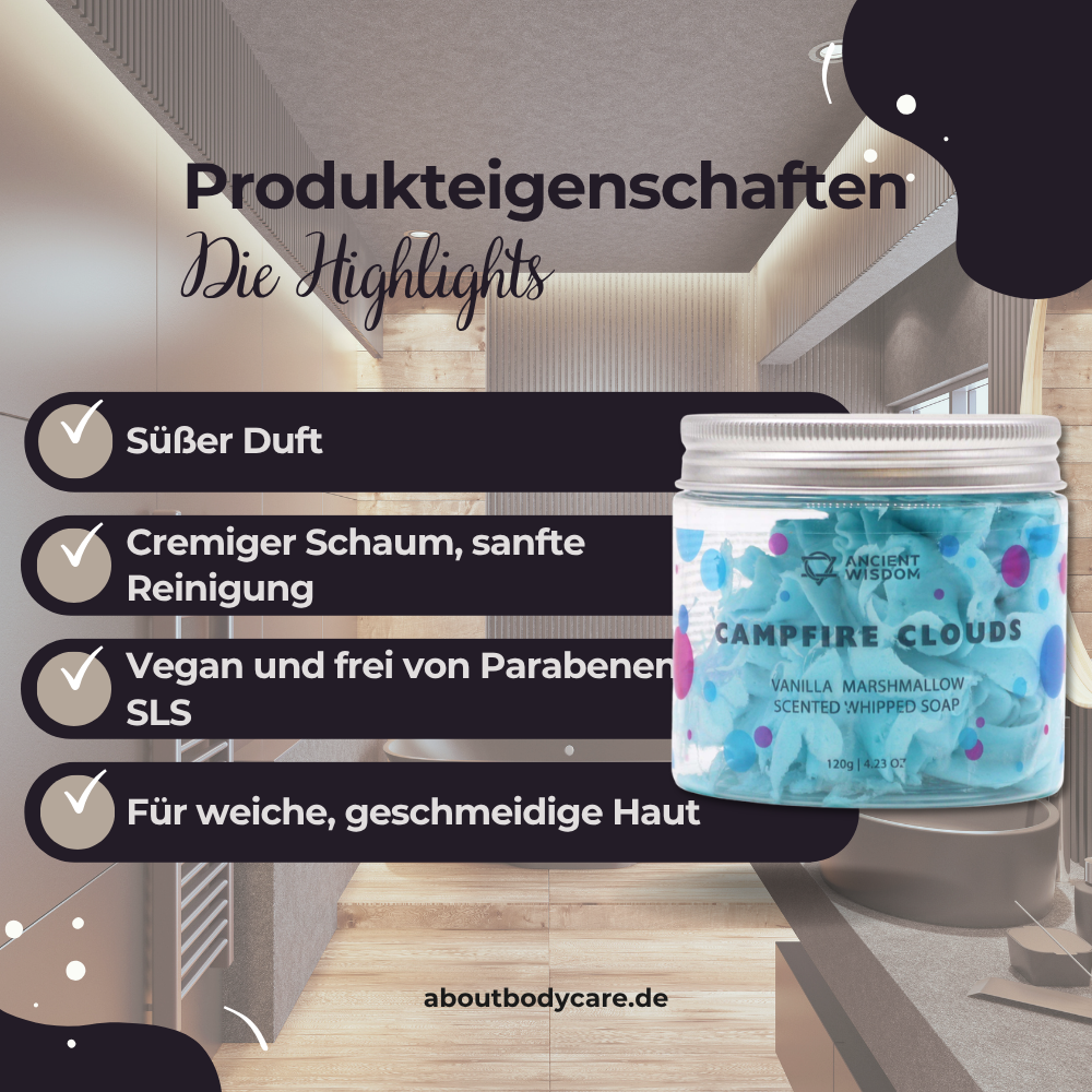 Die Schlagseife Campfire Clouds bietet eine Kombination aus intensiver Schaumbildung, angenehmer Haptik und einem Duft, der Wärme und Behaglichkeit ausstrahlt. Durch ihre luftige Konsistenz lässt sie sich leicht entnehmen und verteilen. Ideal für alle, die Pflege und Dufterlebnis in einem Produkt suchen – ohne tierische Bestandteile, Parabene oder SLS.
