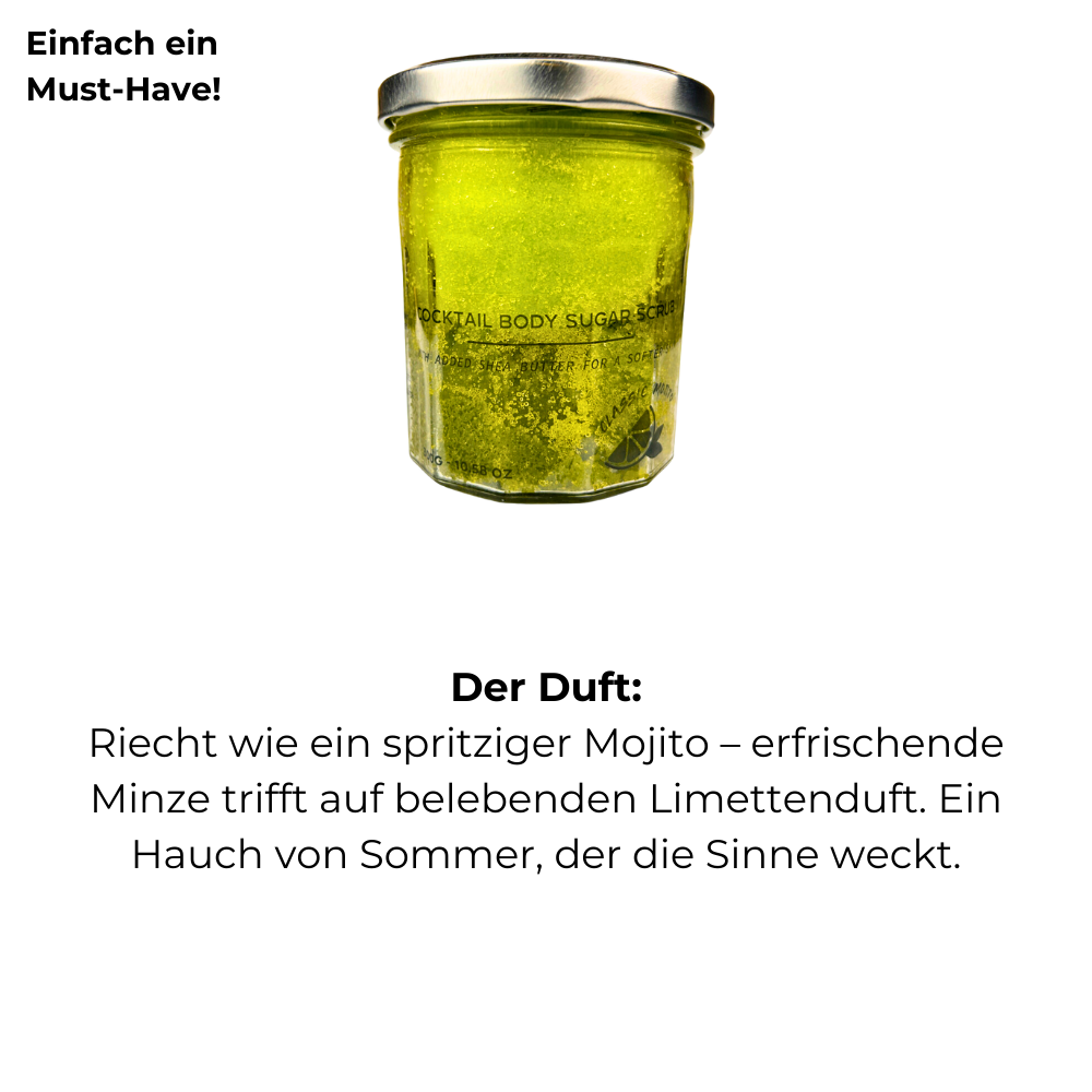 Das Zuckerpeeling Mojito verwöhnt dich mit dem spritzigen Duft von Limette und kühler Minze, der an sonnige Sommerabende und belebende Cocktails erinnert. Der feine Zucker und die pflegenden Öle reinigen sanft, entfernen abgestorbene Hautzellen und sorgen für eine glatte, geschmeidige Haut. Die Kombination aus Frische und Pflege macht dieses Peeling zu einem perfekten Begleiter für deine tägliche Pflegeroutine und schenkt dir ein erfrischendes Hautgefühl, das lange anhält.