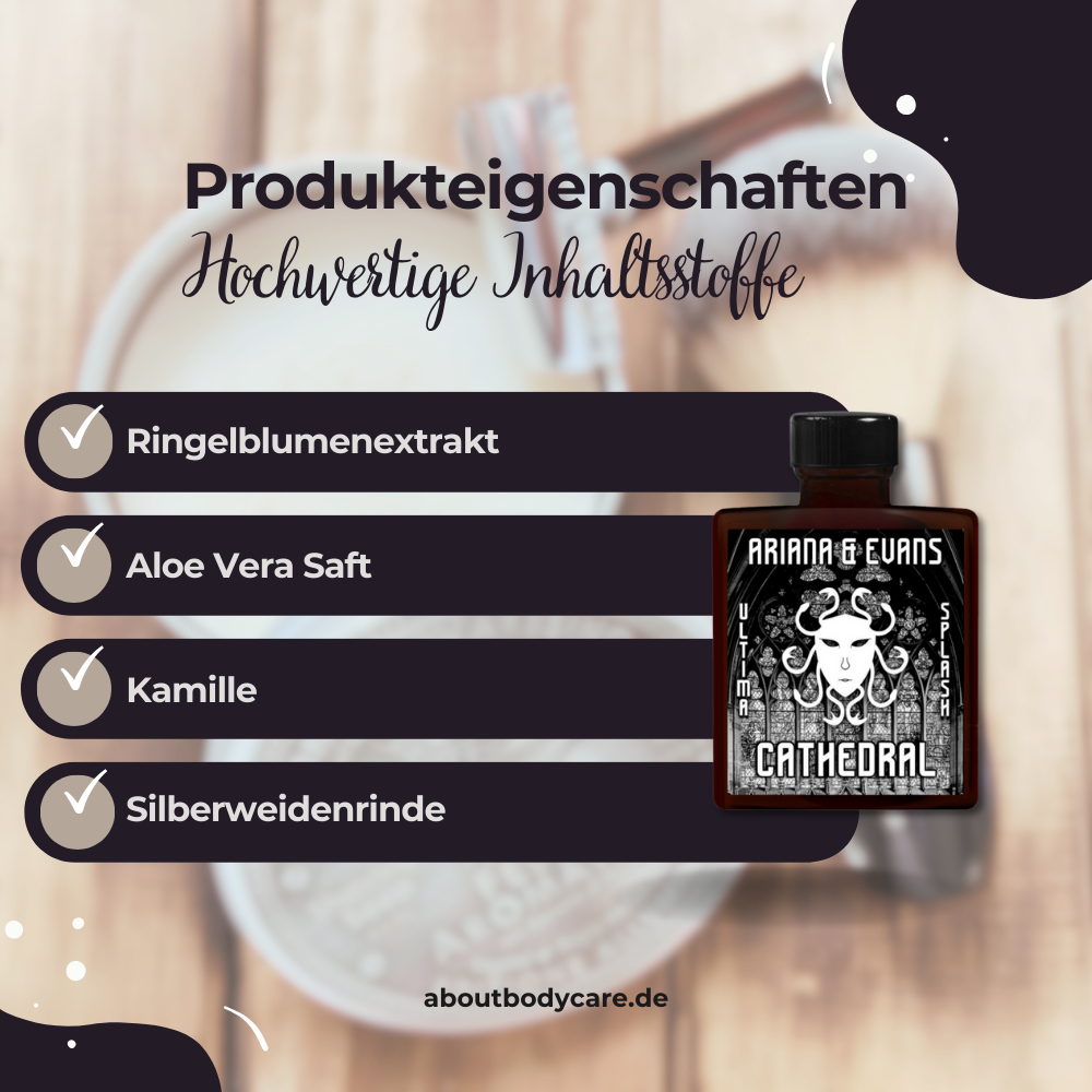 Das Aftershave Cathedral enthält Aloe Vera, pflanzliches Glycerin und Calendula-Extrakt. Kamille und Vitamin E unterstützen die natürliche Pflege der Haut nach der Rasur.