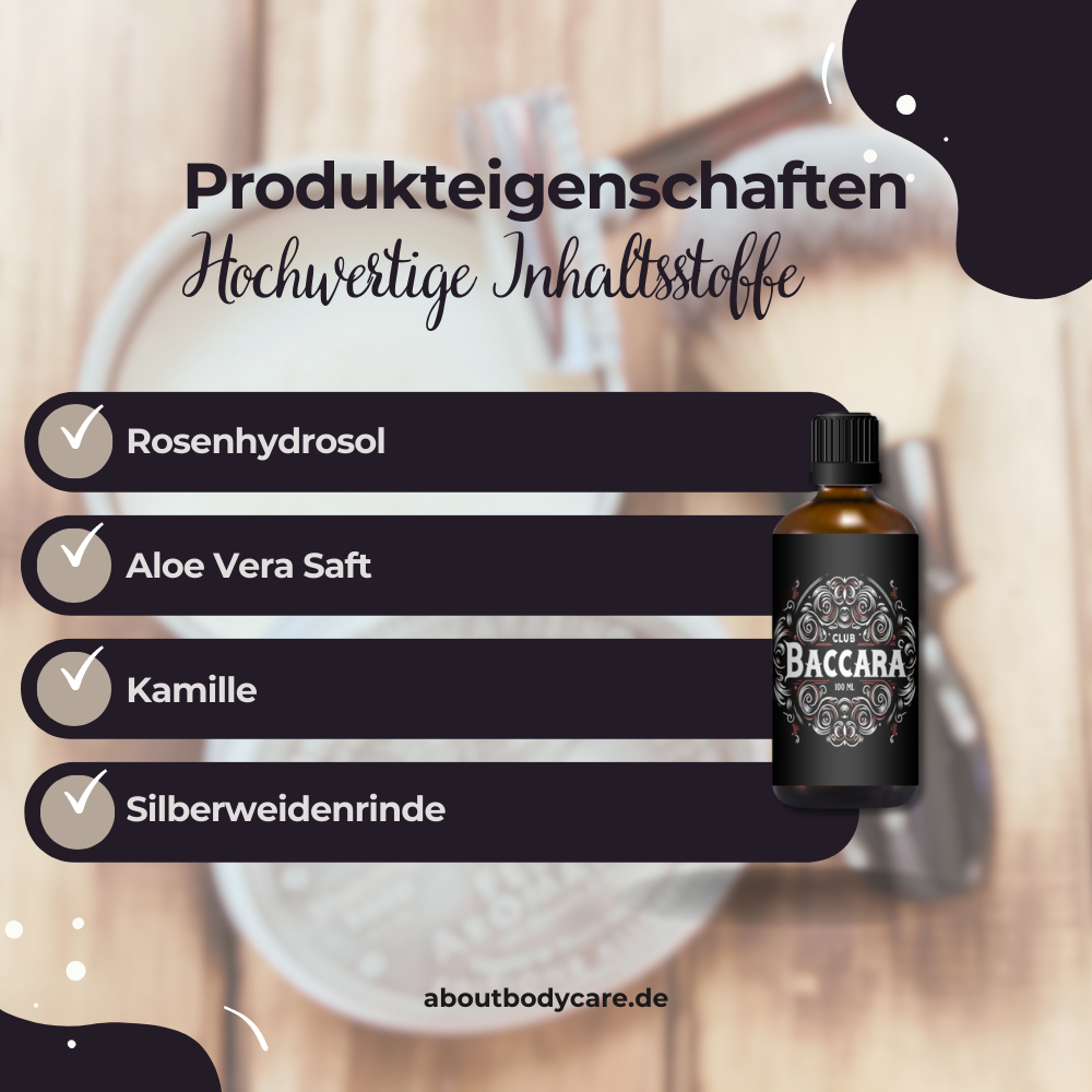 Das Aftershave Club Baccara enthält Aloe Vera, Glycerin, Rosenhydrolat und Kamille. Diese sorgfältig ausgewählten Inhaltsstoffe tragen zu einer angenehmen Anwendung nach der Rasur bei und runden das Pflegeerlebnis ab.