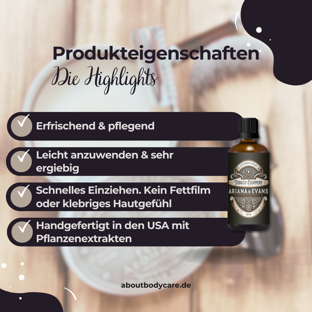 Die Qualität und Sorgfalt, die in jedes Produkt einfließen, zeichnen sich nicht nur in den Düften, sondern auch in der Leistung der Seifen und Aftershaves ab. Ariana & Evans beweist immer wieder, dass Innovation und Tradition Hand in Hand gehen können, um ein einzigartiges Rasurerlebnis zu bieten, das keine Wünsche offenlässt.