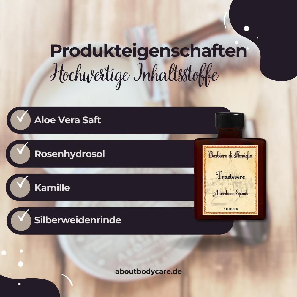Die sorgfältig abgestimmte Rezeptur des Aftershaves Trastevere vereint hochwertige Inhaltsstoffe wie Aloe Vera, pflanzliches Glycerin, Rosenhydrolat und edelste Pflanzenextrakte. Dieses Aftershave überzeugt mit einem einzigartigen Duft und einer pflegenden Wirkung, die deine Haut nach der Rasur verwöhnt.