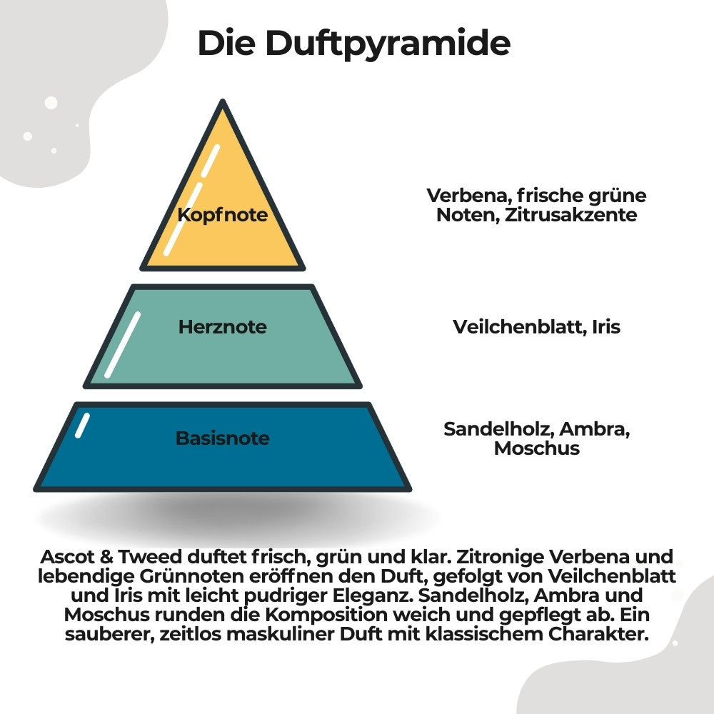 Kurzbeschreibung: Klar-grün und gepflegt im Auftakt, dann fein strukturiert mit Iris/Veilchenblatt. Im Ausklang warm, elegant und „sauber“ wirkend – ein Duftprofil, das sich gut in den Tag einfügt und trotzdem Stil zeigt.