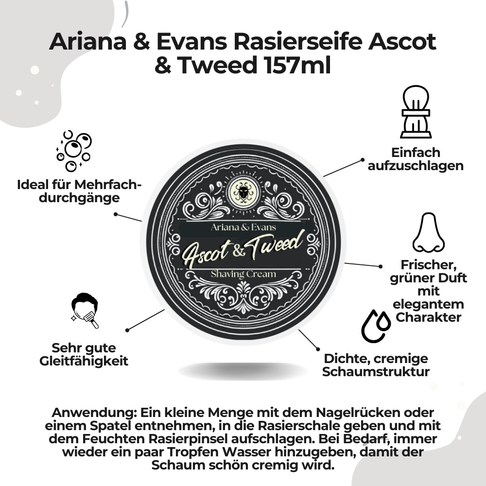 Lösung: Die Rasierseife Ascot & Tweed ist auf dichten, feinporigen Schaum und eine merklich starke Gleitschicht ausgelegt – für kontrollierte Züge und ein gepflegt wirkendes Finish.