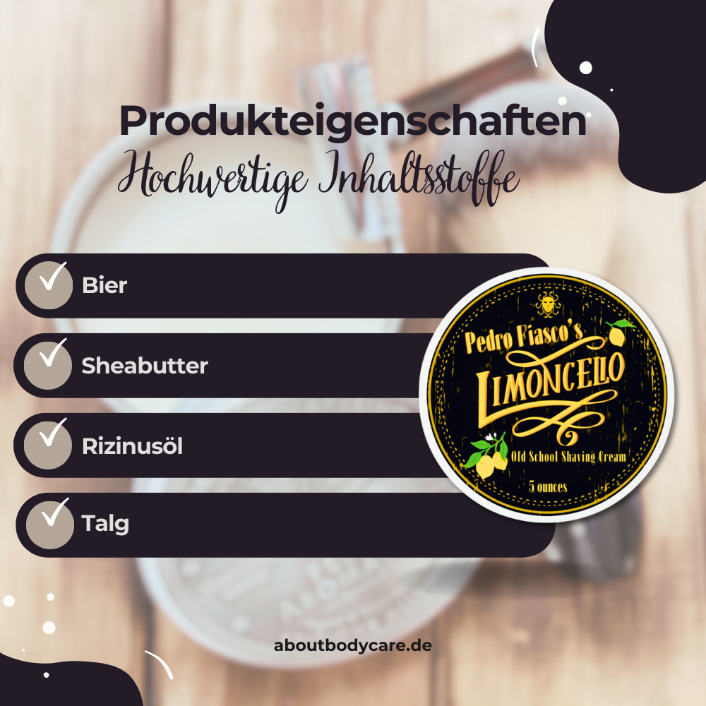 Natürliche Inhaltsstoffe: Hochwertige Rasierseifen wie die Rasierseife Pedro Fiasco’s Limoncello bestehen oft aus natürlichen Ölen und Fetten, die während des Verseifungsprozesses entstehen. Diese Inhaltsstoffe können die Haut pflegen und mit Feuchtigkeit versorgen.
