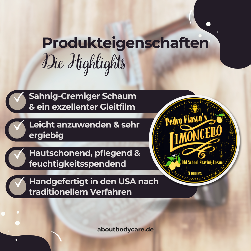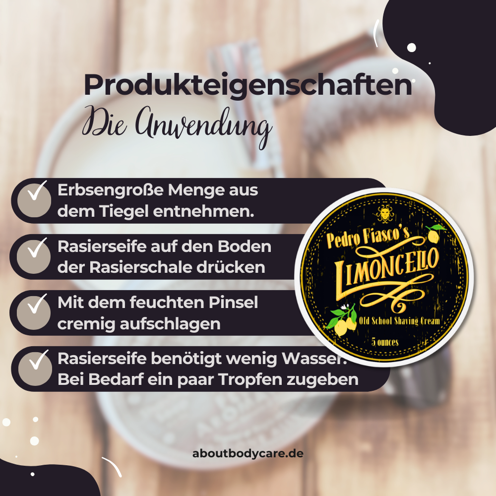 💡 Tipp für Einsteiger: Eine halbfeste Rasierseife wie die Pedro Fiasco’s Limoncello oder eine gut formulierte Rasiercreme schäumt etwas einfacher auf als eine feste Rasierseife. Falls du noch keine Erfahrung hast, starte mit diesen Varianten, um ein Gefühl für die richtige Konsistenz zu bekommen.