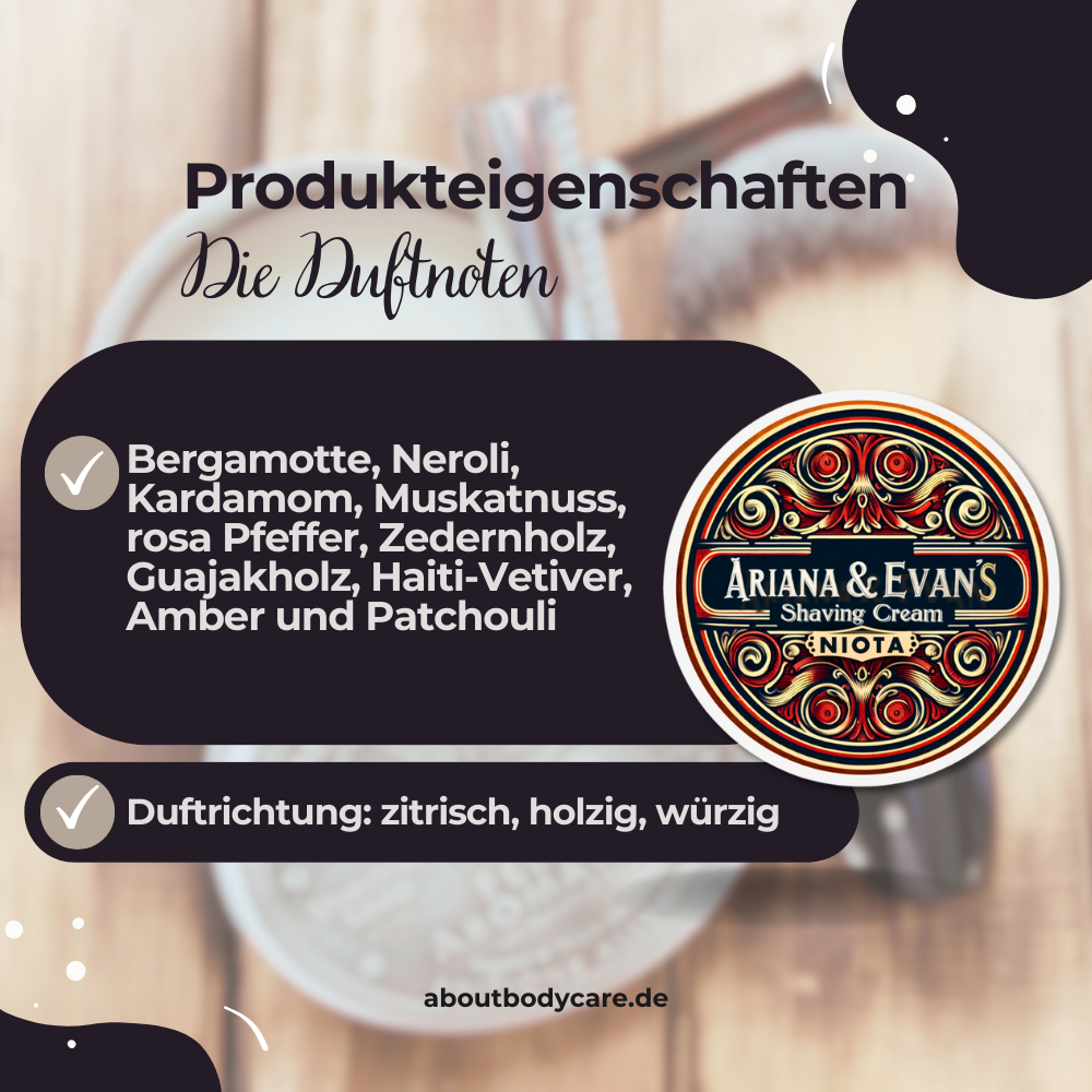 Die Rasierseife Niota von Ariana & Evans bietet nicht nur einen außergewöhnlichen Duft, sondern auch eine luxuriöse Rasur. Mit ihrer einzigartigen Mischung aus frischen, würzigen und holzigen Noten sowie der stabilen, cremigen Textur sorgt sie für ein besonderes Rasurerlebnis.