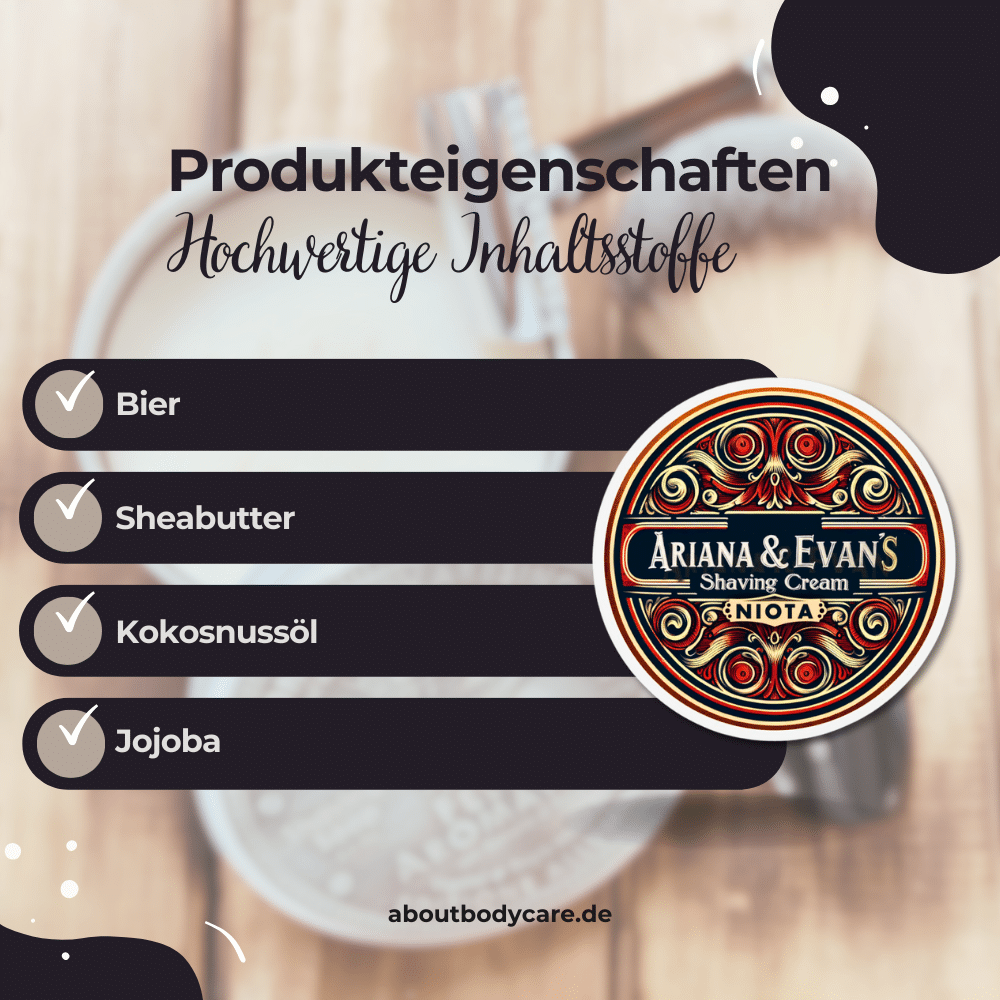 Die Rasierseife Niota enthält hochwertige Inhaltsstoffe wie Sheabutter, Rizinusöl und Kokosöl. Diese Inhaltsstoffe sorgen dafür, dass der Schaum reichhaltig und stabil ist und sich die Rasur besonders angenehm gestaltet.