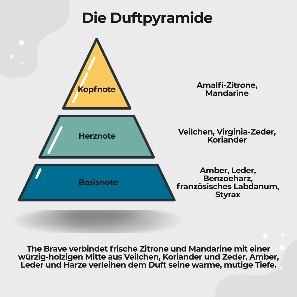 The Brave startet mit einer lebendigen Mischung aus Amalfi-Zitrone und Mandarine. Diese Kopfnote bringt Energie und Klarheit, frisch und hell mit mediterranem Charakter. Ein Auftakt, der Stärke ausstrahlt. Im Herzen entfalten sich Veilchen, Virginia-Zeder und Koriander. Das Veilchen sorgt für Weichheit, während Zeder und Koriander dem Duft Struktur und Würze geben. Ein Zusammenspiel, das Selbstbewusstsein und Charakter zeigt.
