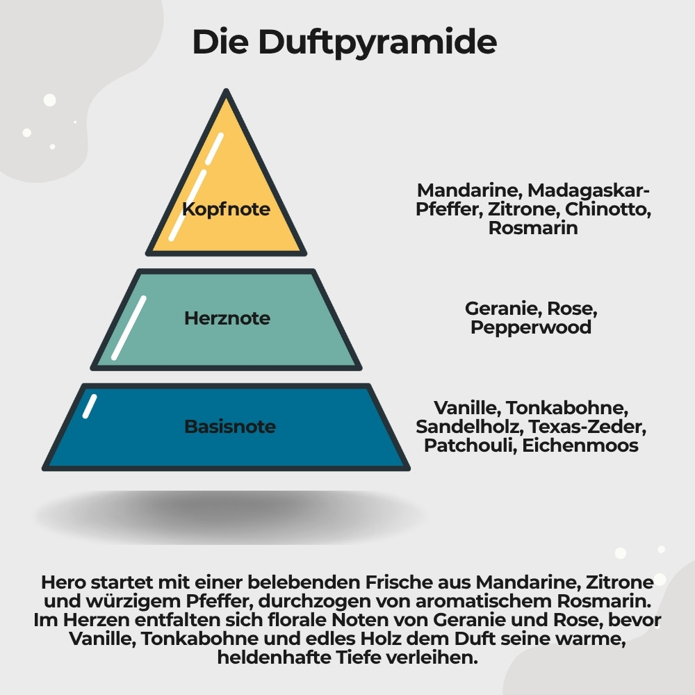 Frisch, würzig und warm zugleich – das Eau de Parfum Hero öffnet mit lebendiger Zitrusenergie, durchzogen von Pfeffer und Rosmarin. Florale und holzige Akzente verleihen Tiefe, während Vanille und Tonkabohne den Duft in eine cremig-warme Signatur führen.