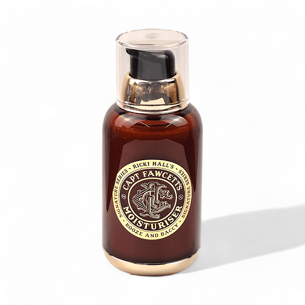 Captain Fawcett präsentiert stolz die Booze & Baccy Feuchtigkeitscreme – eine luxuriöse, maßgeschneiderte Pflege, die subtil nach Ricki Halls „Booze & Baccy“ Signature Series duftet.