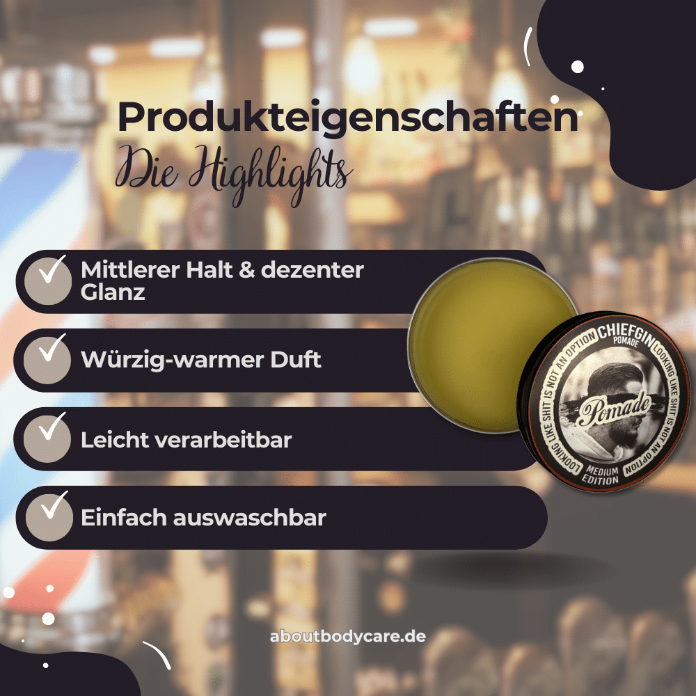 Die Chiefgin Medium Pomade ist perfekt, wenn du einen natürlichen, formbaren Style willst. Sie bietet mittleren Halt, der den ganzen Tag funktioniert. Der warme Duft wirkt angenehm, und die pflegenden Öle machen das Styling komfortabel und sanft fürs Haar.