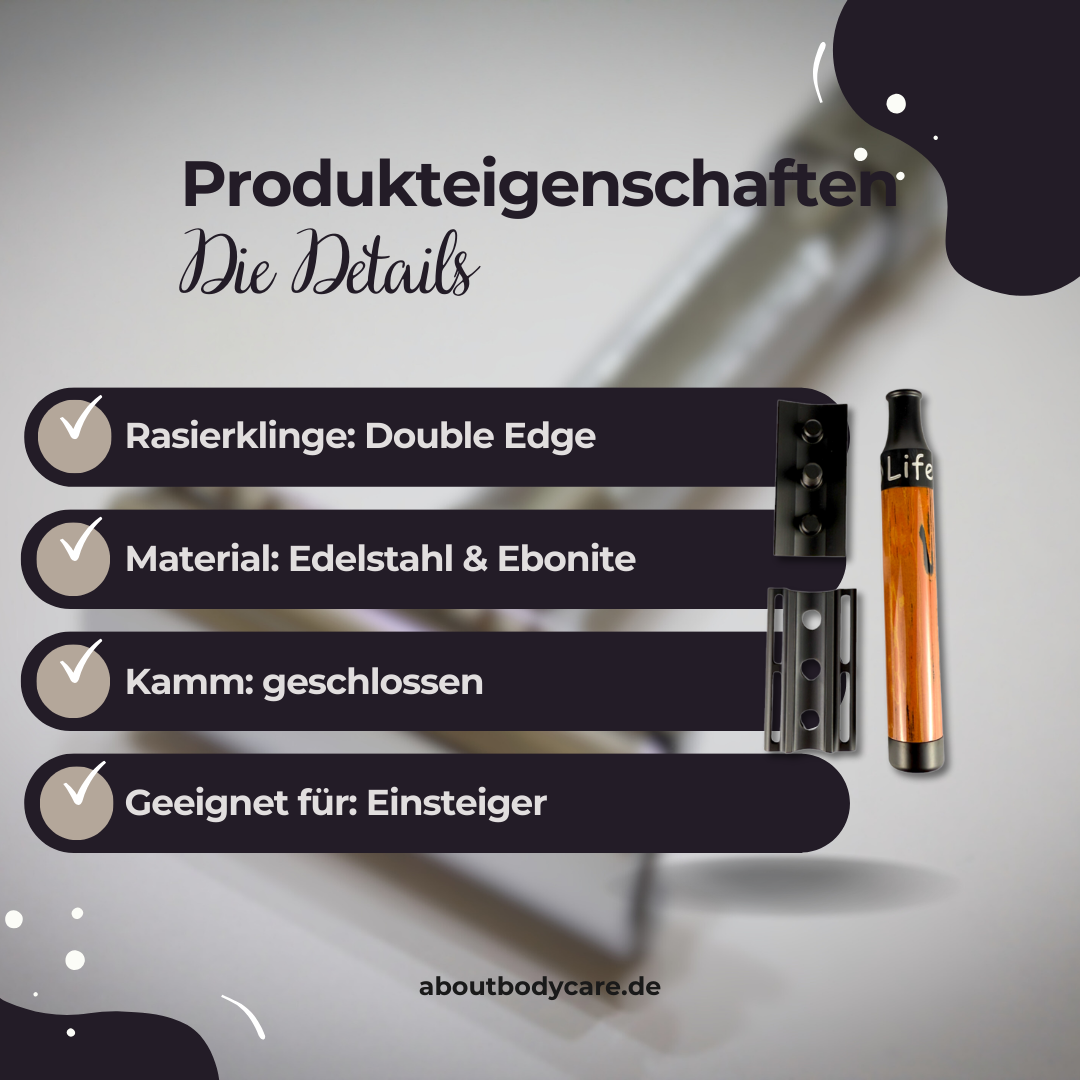 Jeder Rasierhobel Life Barcelona wird mit Liebe zum Detail gefertigt – von der Materialauswahl bis zur perfekten Balance. Die Verwendung von Ebonite für die Griffe verleiht jedem Stück eine individuelle Optik und macht es zu einem echten Sammlerstück.