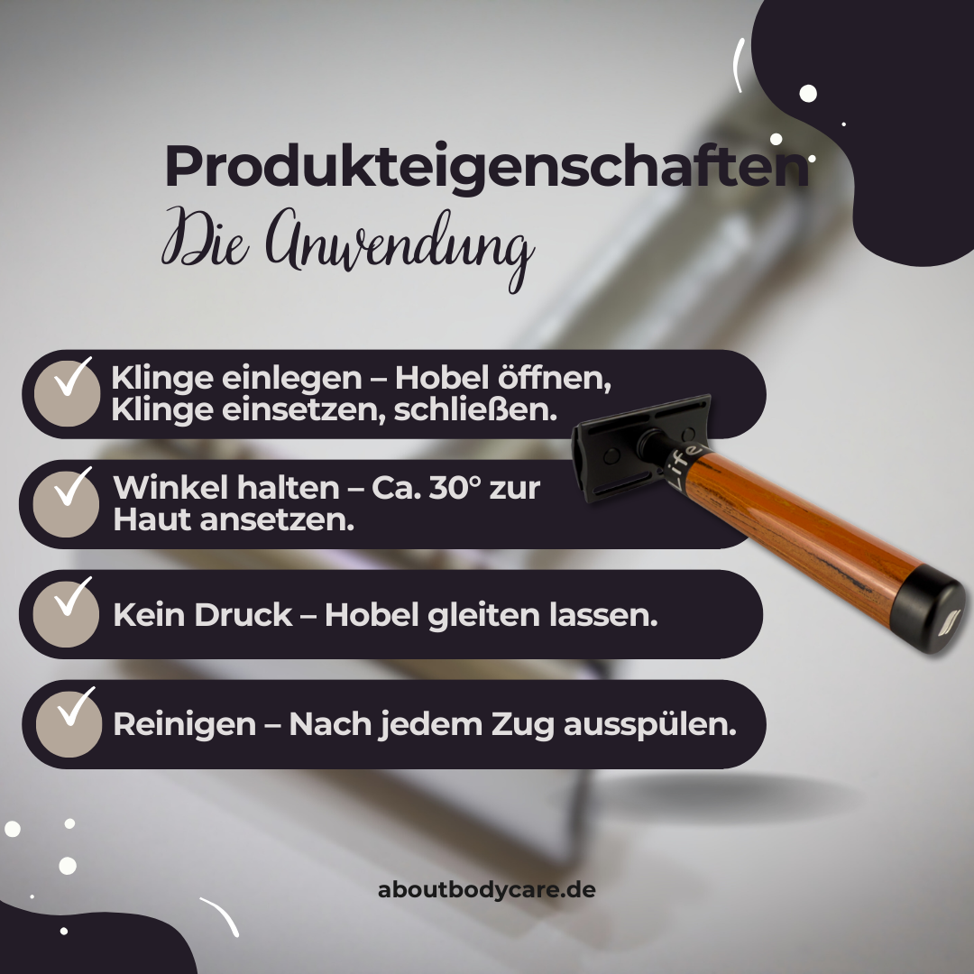 Den Rasierhobel in einem flachen Winkel (ca. 30°) zur Haut ansetzen und mit leichtem Druck über die Haut führen – die Klinge erledigt die Arbeit. Immer in kurzen, kontrollierten Zügen rasieren und die Haut leicht spannen. Für optimale Ergebnisse empfiehlt sich eine Rasierseife oder -creme, um die Gleitfähigkeit zu verbessern. Bei dichtem und dickem Bartwuchs empfiehlt sich vorab ein Pre-Shave zu benutzen. Idealerweise ist man frisch aus der Dusche gekommen, da der Wasserdampf bereits die Poren öffnet und das Barthaar weicher macht. Hat man nicht geduscht, sollte man sich einen warmen Wickel für ca. 2-3 Minuten um das Gesicht legen. Dies hat einen ähnlichen Effekt wie das Duschen.