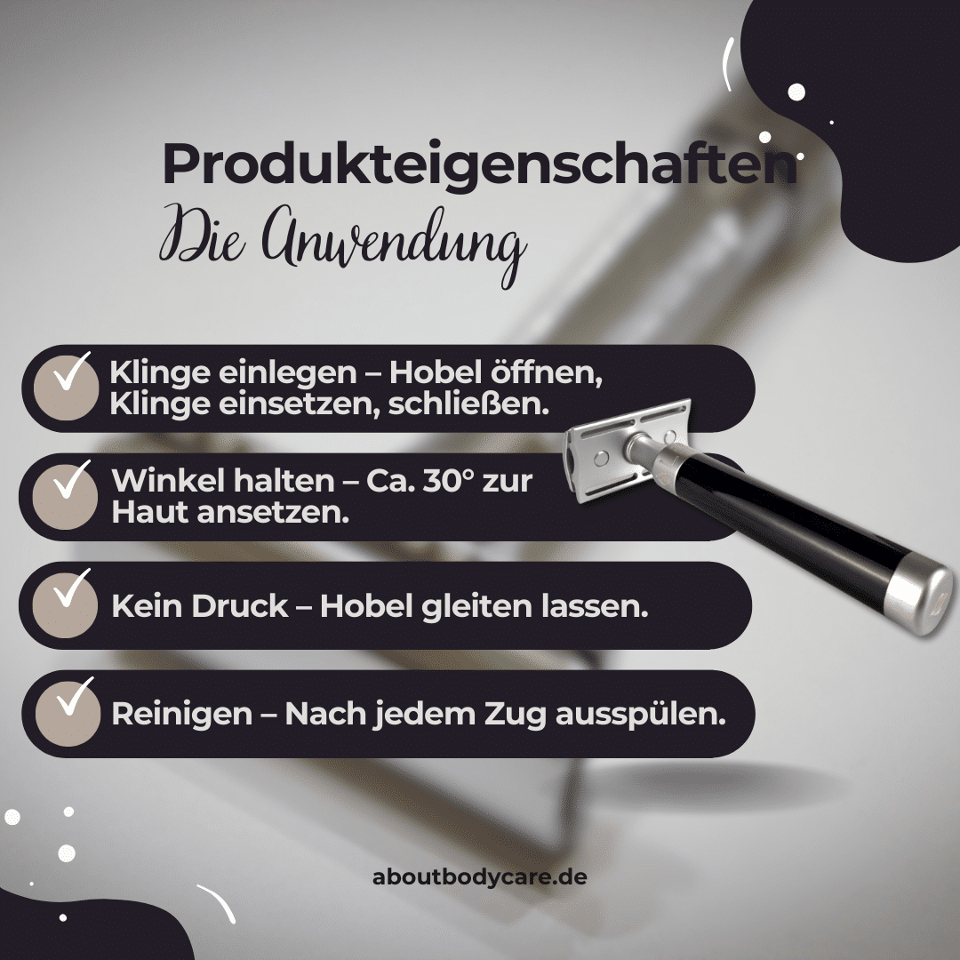 Den Rasierhobel in einem flachen Winkel (ca. 30°) zur Haut ansetzen und mit leichtem Druck über die Haut führen – die Klinge erledigt die Arbeit. Immer in kurzen, kontrollierten Zügen rasieren und die Haut leicht spannen. Für optimale Ergebnisse empfiehlt sich eine Rasierseife oder -creme, um die Gleitfähigkeit zu verbessern. Bei dichtem und dickem Bartwuchs empfiehlt sich vorab ein Pre-Shave zu benutzen. Idealerweise ist man frisch aus der Dusche gekommen, da der Wasserdampf bereits die Poren öffnet und das Barthaar weicher macht. Hat man nicht geduscht, sollte man sich einen warmen Wickel für ca. 2-3 Minuten um das Gesicht legen. Dies hat einen ähnlichen Effekt wie das Duschen.