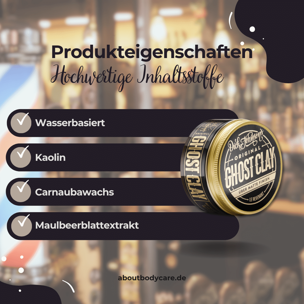 Das Matt Clay Ghost Clay kombiniert Kaolin, Glycerin, pflanzliche Wachse und feine Duftstoffe zu einer geschmeidigen Stylingformel. Die Inhaltsstoffe unterstützen eine leichte Verarbeitung, angenehme Textur und das gewünschte matte Finish