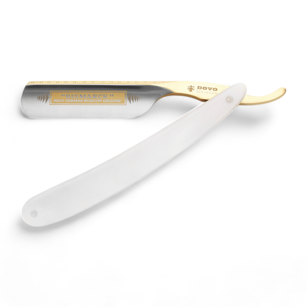 DOVO Rasiermesser Bismarck Nr. 2 Perla in 6/8 Zoll – Hier haben wir einen weiteres Bismarck 2 Rasiermesser aus dem Hause Dovo Solingen. Dieses wunderschöne Exemplar mit Verzierungen aus 24 Karat Gold und einem Acryl Pearl Griff wird zu über 90% von den besten Schleifern handgefertigt. Eine wunderschöne Arbeit, die sofort ins Auge fällt und sich großer Beliebtheit erfreut. Warum, erzählen wir Dir gleich!
