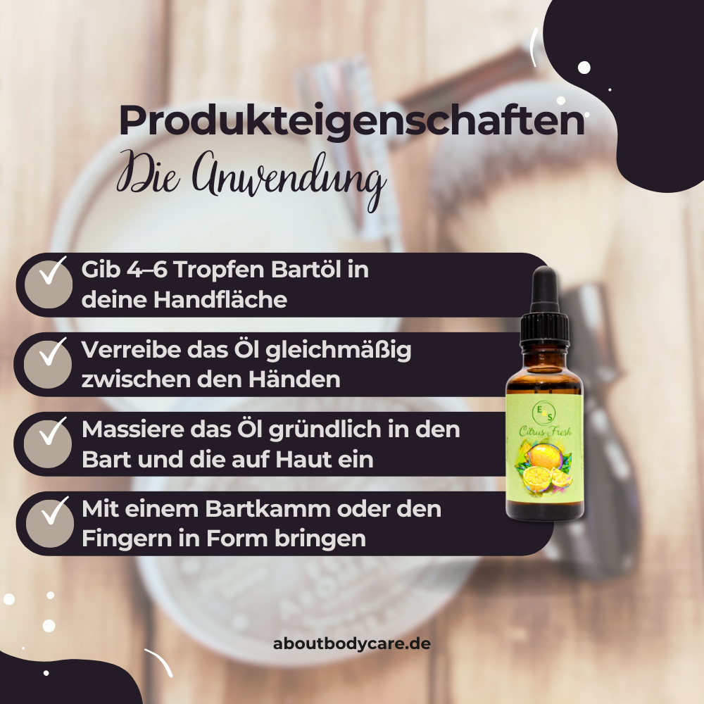 Bartöl Citrus Fresh lässt sich mühelos in deine tägliche Pflegeroutine einbauen und entfaltet seine Wirkung direkt beim Auftragen. Befeuchte deinen Bart leicht nach dem Duschen – so kann das Öl besser einziehen und deine Haut optimal versorgen. Je nach Länge gibst du 2–6 Tropfen in deine Handflächen, erwärmst es kurz und verteilst es gleichmäßig im Bart. Massiere es sorgfältig ein, bis Haut und Haare gepflegt wirken und kein Trockenheitsgefühl bleibt. Mit einem Kamm aus Holz oder einer Bartbürste bringst du dein Styling in Form. Bartöl Citrus Fresh zieht schnell ein und sorgt für ein frisches, geschmeidiges Finish mit zitrischer Energie.