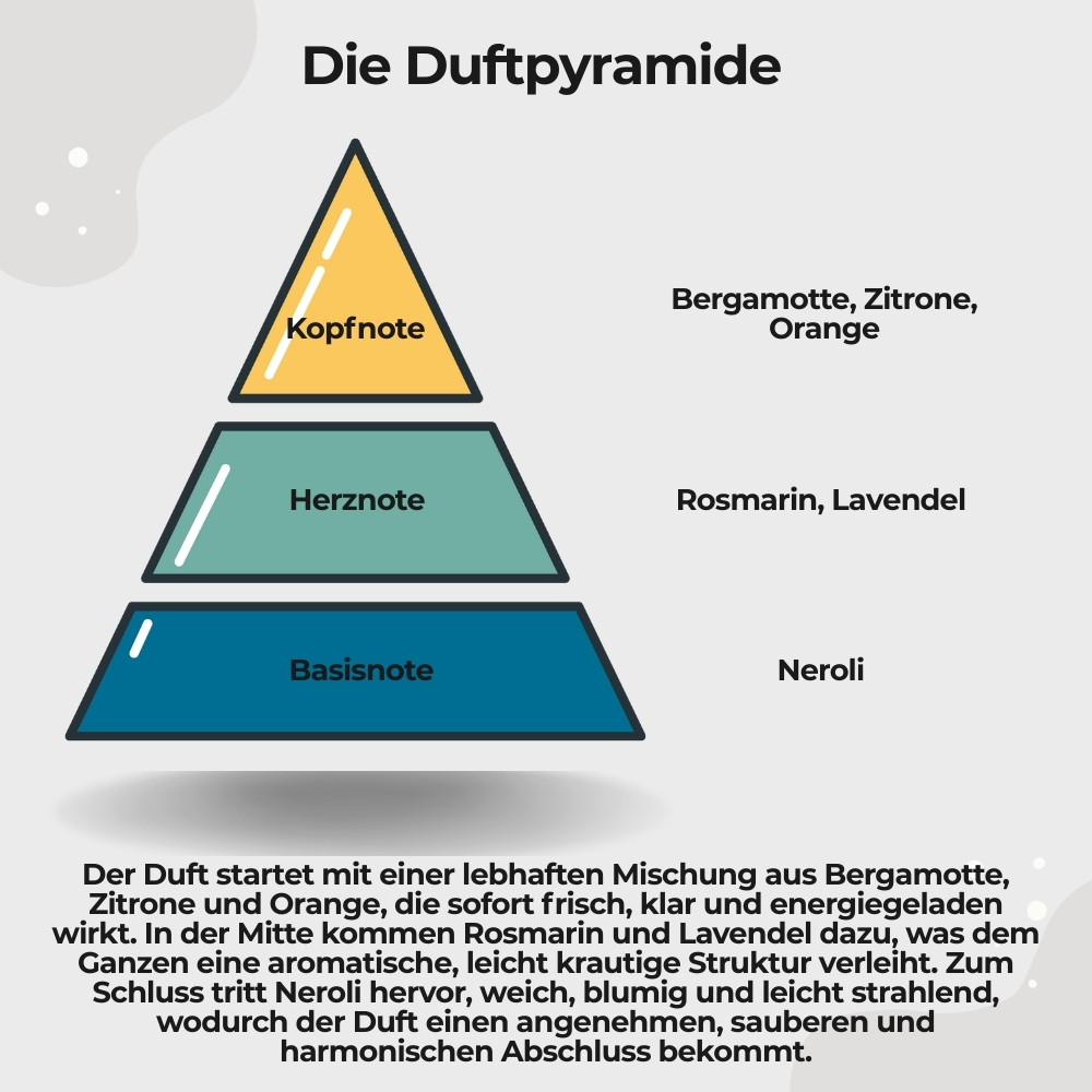 Der Duft startet frisch und zitrisch mit Bergamotte, Zitrone und Orange, entwickelt im Schaum eine aromatische Kräuternote aus Rosmarin und Lavendel und klingt sauber und hell mit Neroli aus.