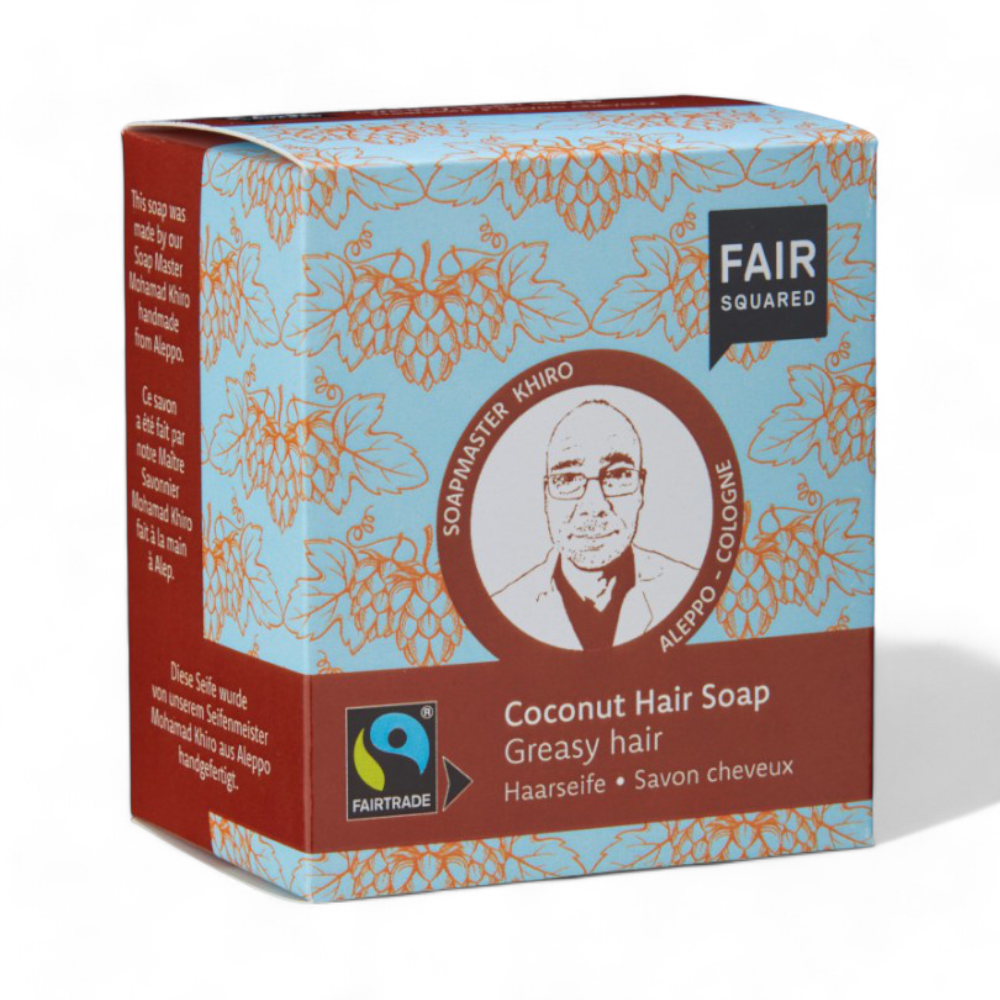 Die Hair Soap Coconut ist in diesem Fall als praktische 2er-Kombi mit einem Bio-Baumwollsäckchen verfügbar. Fair Squared legt großen Wert auf Qualität und Fair Trade, daher beträgt die Überfettung der Seife 1,5 % und sie enthält beeindruckende 40,6 % Fairtrade-Anteil. Das Kokosöl, das hier verwendet wird, ist Fairtrade-Zertifiziert und stammt aus Indien.