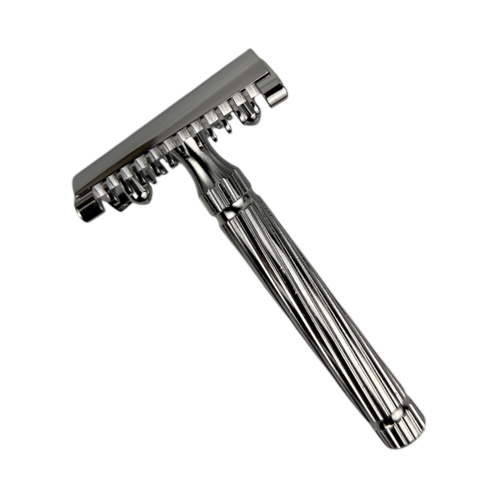 Fatip Rasierhobel Il Piccolo Storto. Torsionshobel mit offenem Kamm. Brillantes Silber poliertes Nickel-Finish.