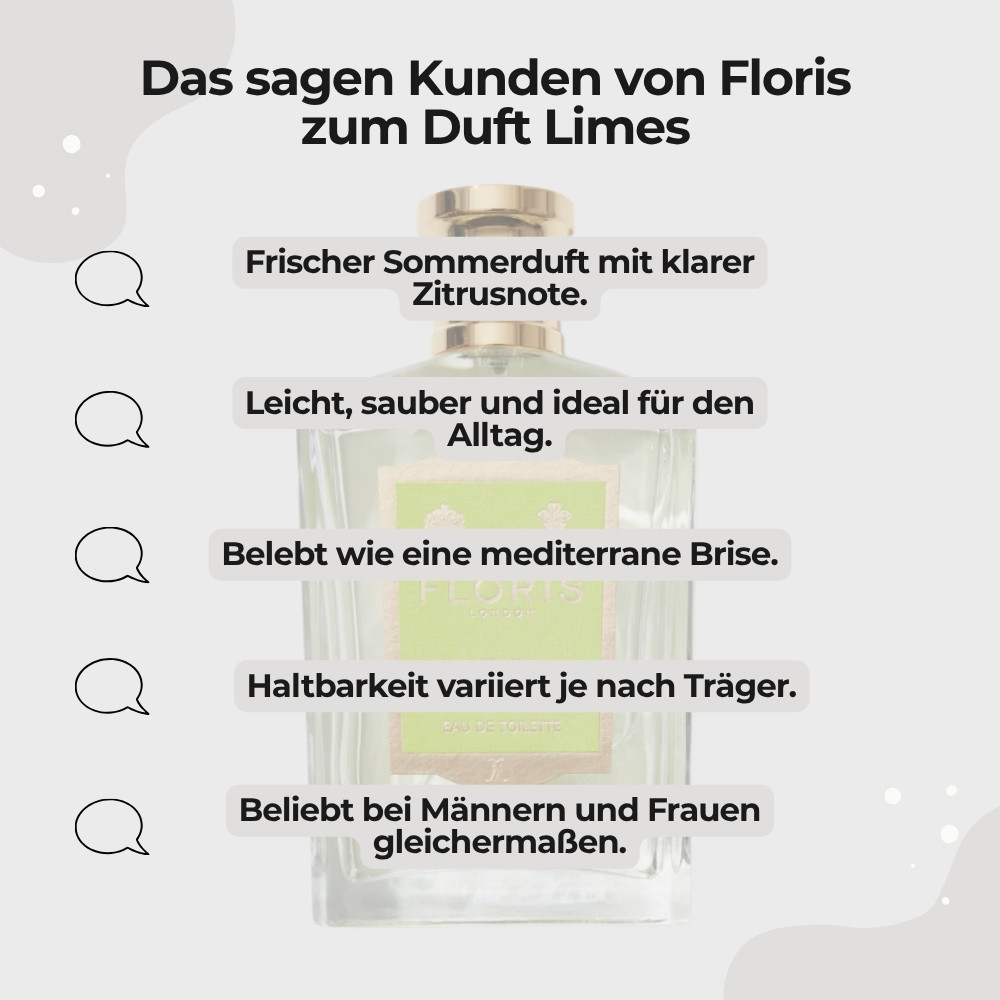 Weil viele Sommerdüfte an Klarheit oder Balance verlieren. Das Eau de Toilette Limes von Floris London vereint sehr lebendige Zitrusfrische mit sanfter, floraler Eleganz und einer feinen Moschus-Basis. Traditionsreich und perfekt für warme Tage – ein Duft, der Natürlichkeit, Stil und Frische ideal verbindet – für sie und ihn.