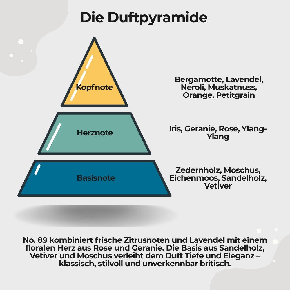 Der Auftakt von Eau de Toilette No.89 ist klassisch britisch, frisch und elegant. Lavendel, Orange und Petitgrain verleihen eine zitrisch-herbe Klarheit, dezent untermalt von Muskatnuss. Im Herzen entfalten sich Rose, Geranie, Iris und Ylang-Ylang, warm, floral und harmonisch, mit der Rose als feinem Akzent. Sandelholz und Vetiver geben der Basis Tiefe und Charakter, sanft begleitet von Zedernholz und Moschus. Ein Duft, der Frische, Eleganz und Understatement perfekt vereint.