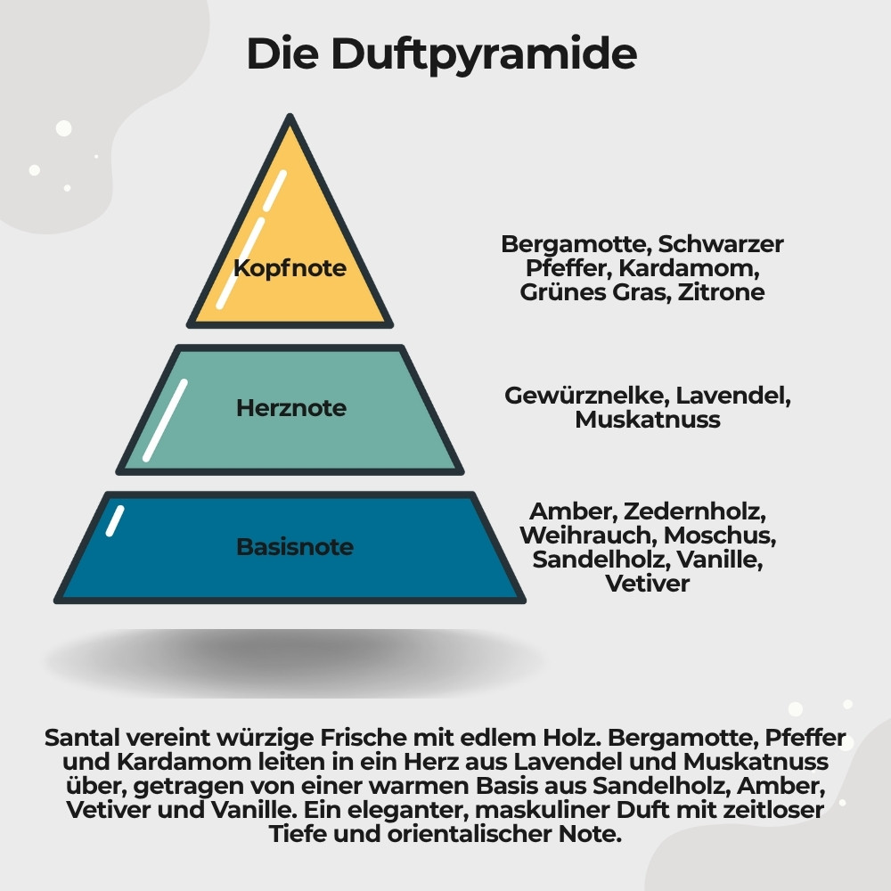 Santal ist vielseitig. Tagsüber unterstreicht er souveräne Eleganz, am Abend zeigt er seine sinnliche, tiefe Seite. Perfekt für besondere Anlässe, elegante Abende oder Momente, in denen du Eindruck hinterlassen möchtest.