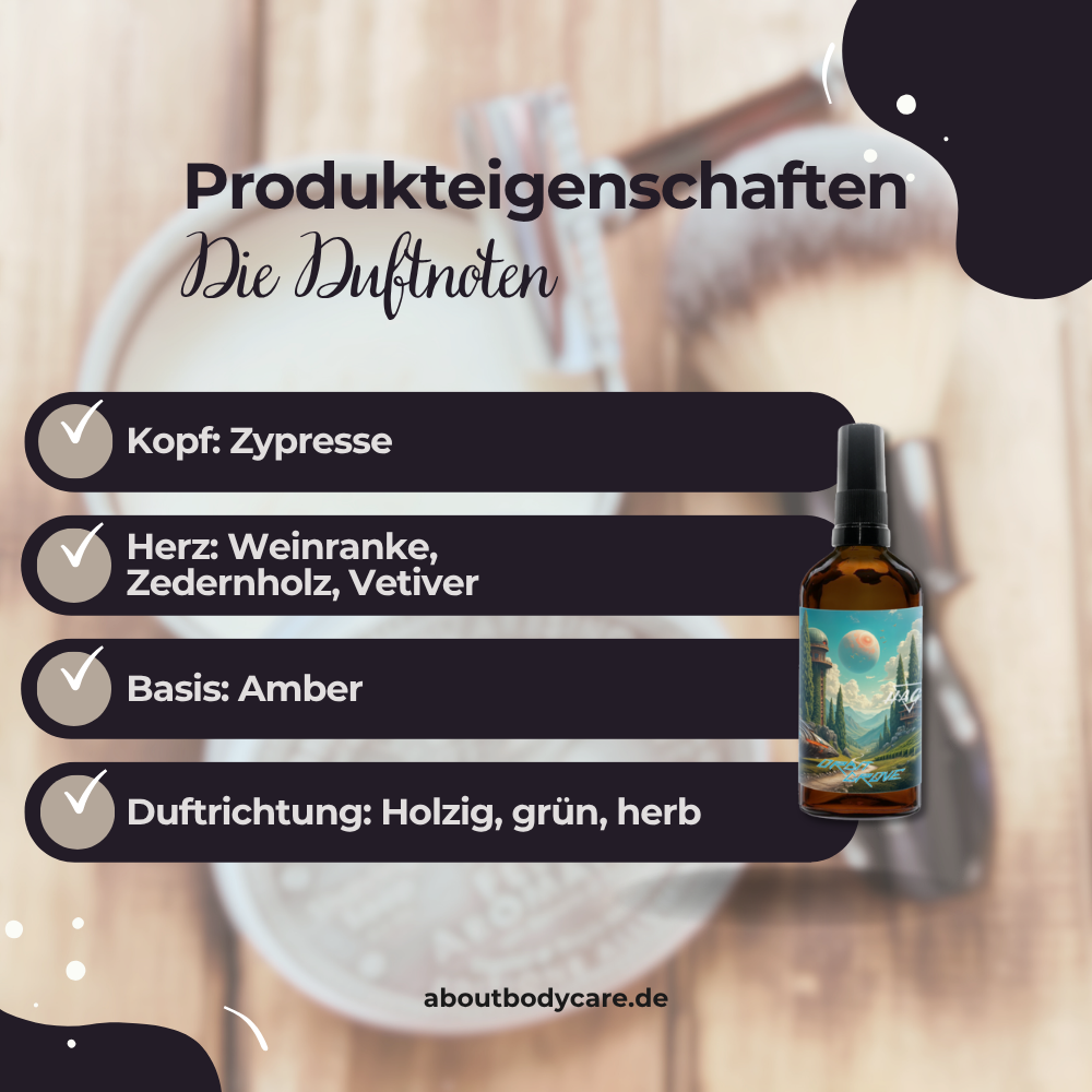 Die Duftreise beginnt mit einer kühnen Note: Zypresse, grün, klar, fast elektrisierend. Wie ein Signal, das aus einem stillen Orbit zurück zur Erde strahlt. Kurz darauf öffnet sich ein vielschichtiger Kern: Weinrebe, holzige Tiefe von Zedernholz und die Wärme von Vetiver schaffen ein Bild von uralten Wäldern unter einem fremden Himmel.