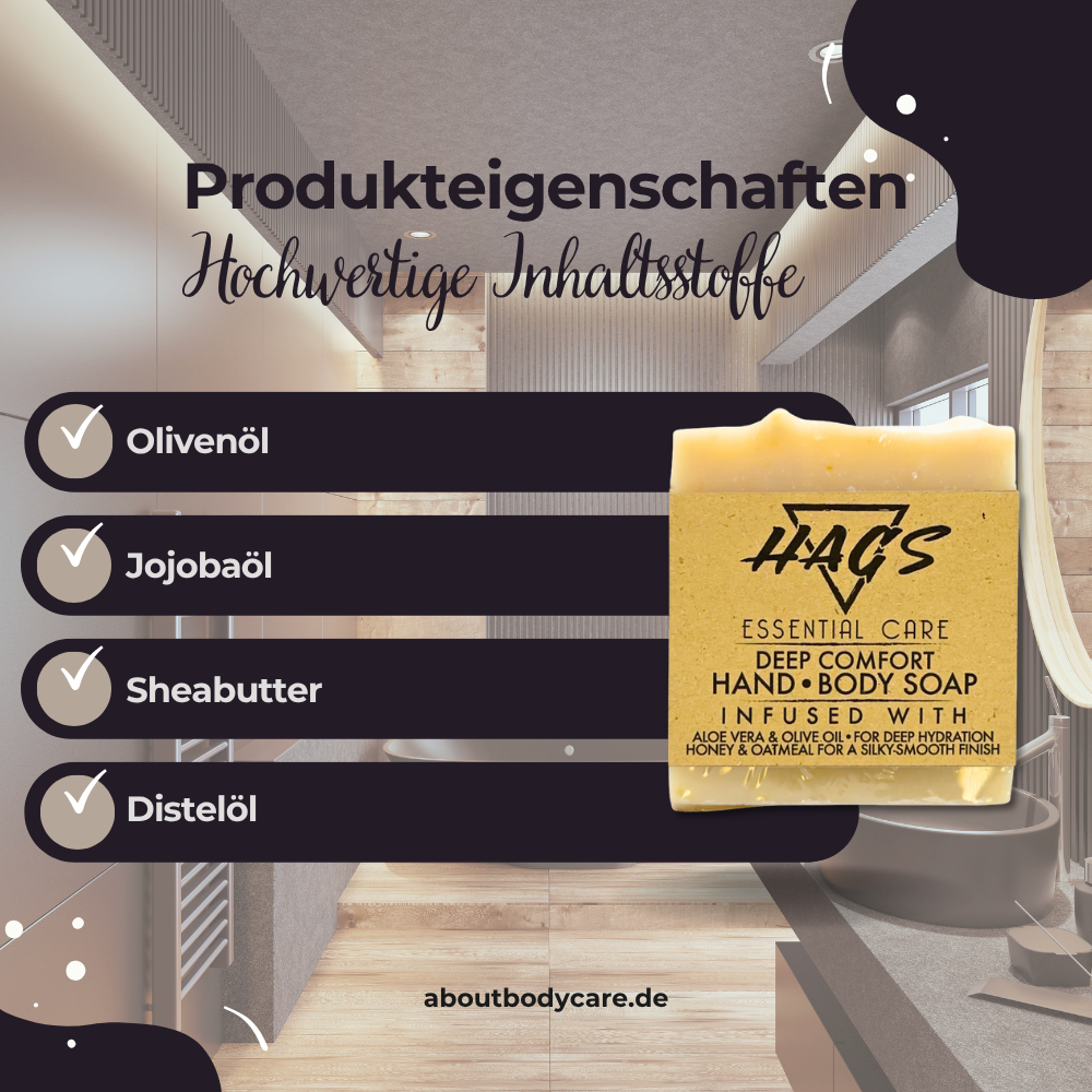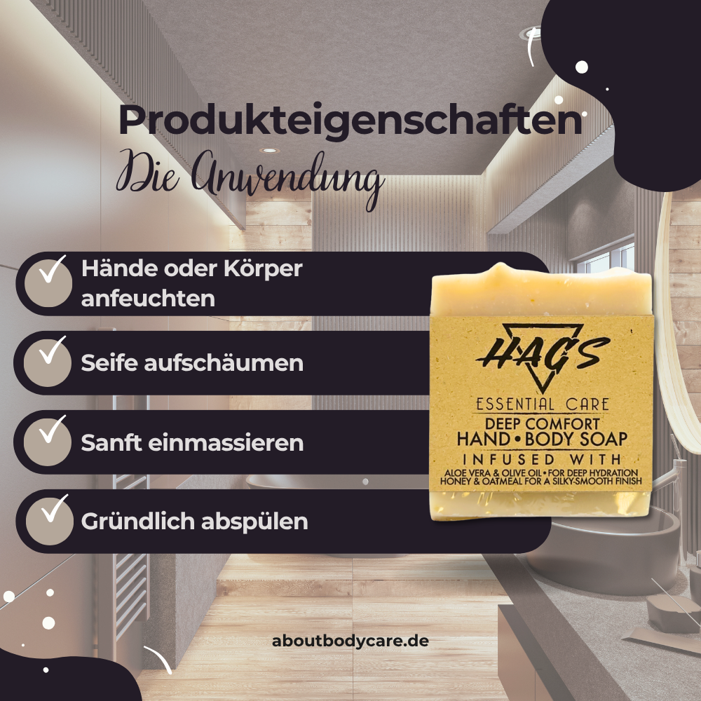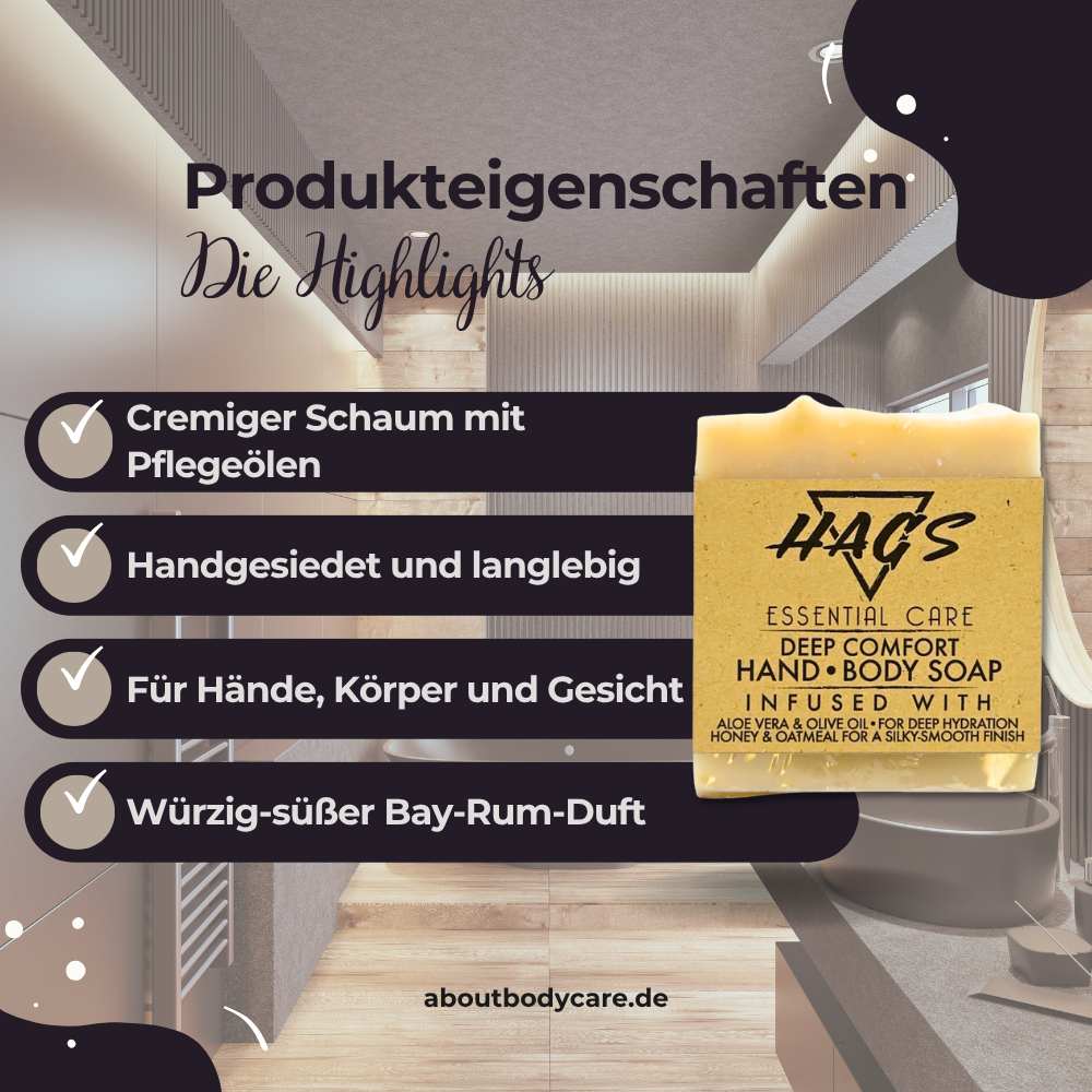 Feste Seifenstücke wie die Körperseife Isla Muerta sind nicht nur umweltfreundlicher als Duschgels, sondern auch pflegeintensiver, ergiebiger und stilvoller im Badezimmer. HAGS bietet mit seiner Essential Care Linie Seifen, die sich durch langanhaltende Qualität, starke Pflegeleistung und feinen Duft auszeichnen.