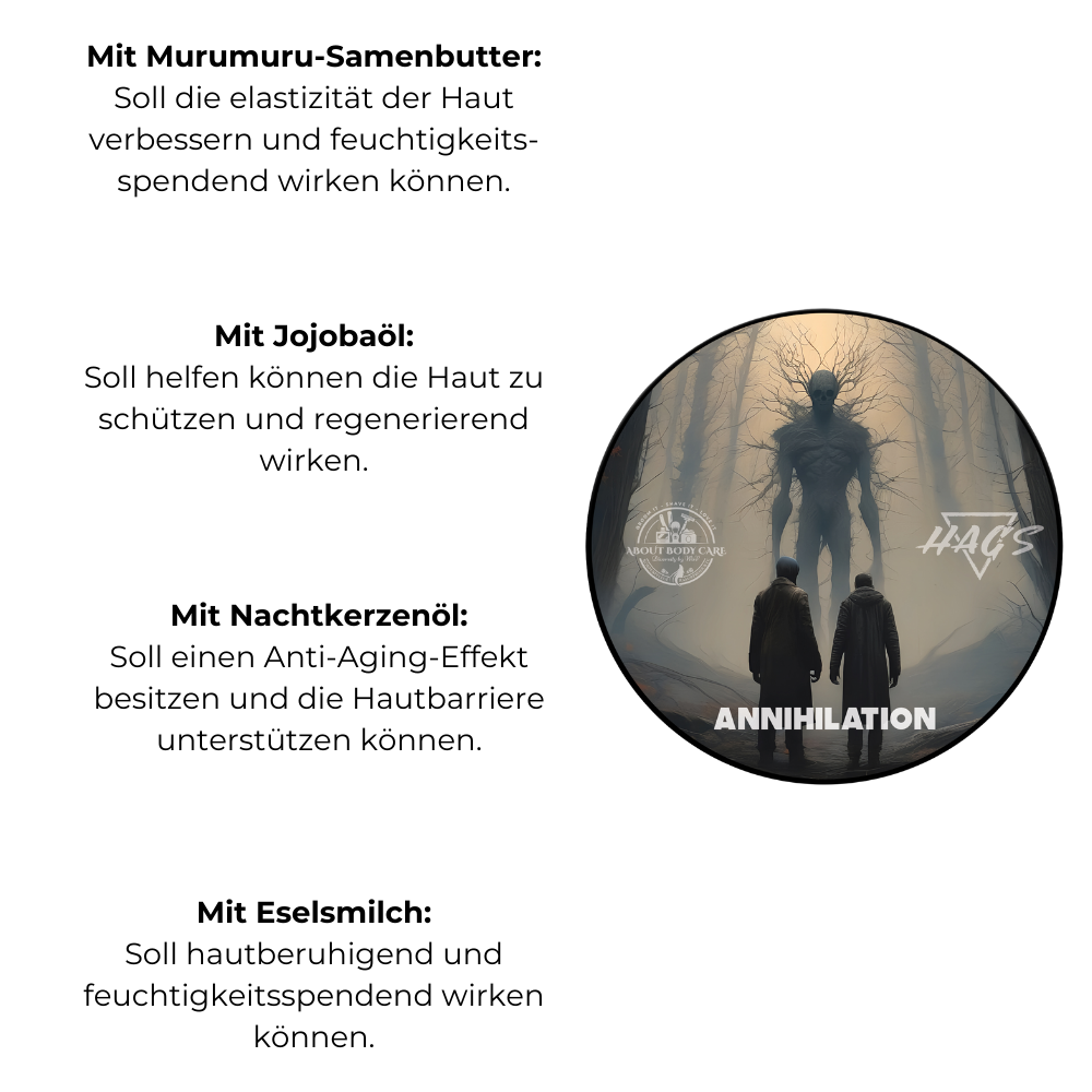 DIe Annhilation Rasierseife ist ein Kooperationsprojekt zwischen Aboutbodycare und HAGS. Aus diesem Grund, wirst du die Seife sowie weitere Produkte aus der Serie künftig nur hier im Shop erwerben können. Ganze vier Monate haben wir für das Projekt benötigt – und? Es ist super geworden!