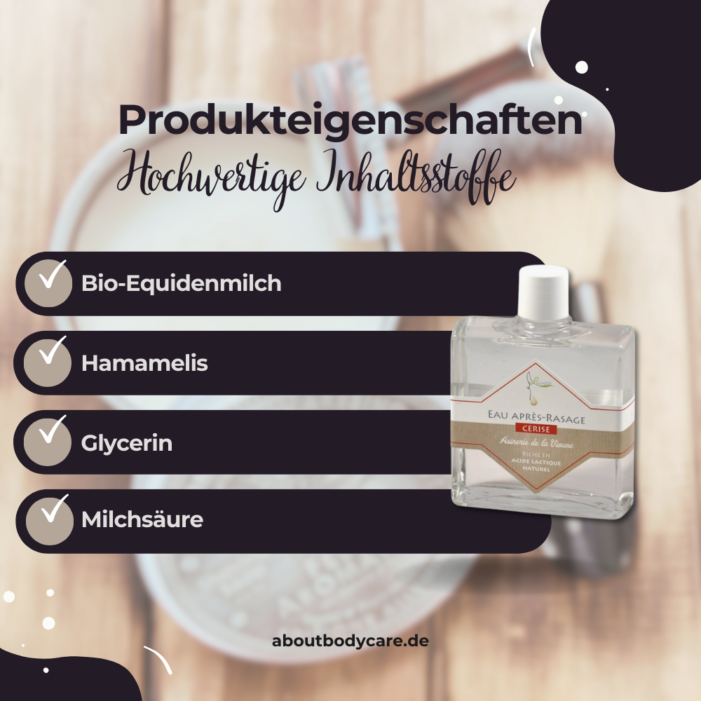 Die After Shave Lotion Cerise enthält Bio-Equidenmilch, Glycerin und Milchsäure. Diese Inhaltsstoffe spenden Feuchtigkeit, beruhigen die Haut nach der Rasur und unterstützen die Regeneration. Milchsäure und Glycerin helfen, die Haut geschmeidig zu halten und sorgen für ein angenehm weiches und erfrischtes Hautgefühl.