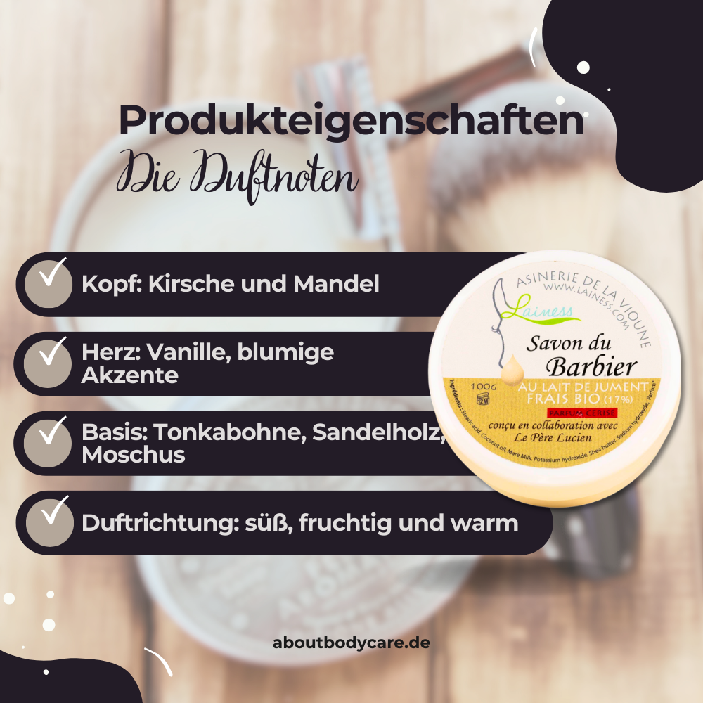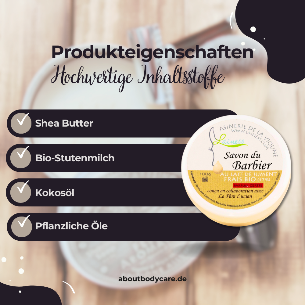 Die Rasierseife Cerise enthält Sheabutter, frische Stutenmilch, Kokosöl und pflanzliche Öle. Diese besondere Kombination erzeugt einen reichhaltigen, cremigen Schaum und pflegt die Haut intensiv. Stutenmilch und Sheabutter spenden Feuchtigkeit und könnten für ein geschmeidiges Hautgefühl sorgen, während die cremige Textur die Rasur besonders angenehm macht.