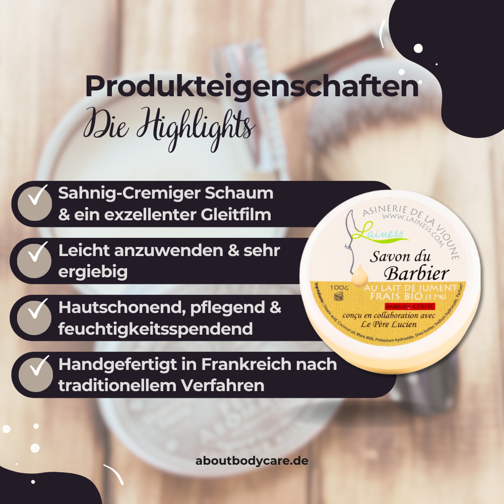 Die Rasierseife Cerise bietet dichten, cremigen Schaum und exzellente Gleitfähigkeit für eine sanfte Rasur. Handgefertigt in Frankreich, überzeugt sie mit Sheabutter und frischer Stutenmilch, die die Haut pflegen und geschmeidig halten.