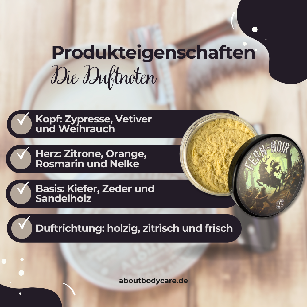 Stell dir vor, frische Zitrusnoten treffen auf aromatische Kräuter, während holzige Nuancen und Harze dem Duft eine erdige Tiefe verleihen. Ein Aroma, das an einen nebligen Waldspaziergang erinnert – mystisch, warm und voller natürlicher Eleganz. Genau das erlebst du mit der Rasierseife Fern Noir