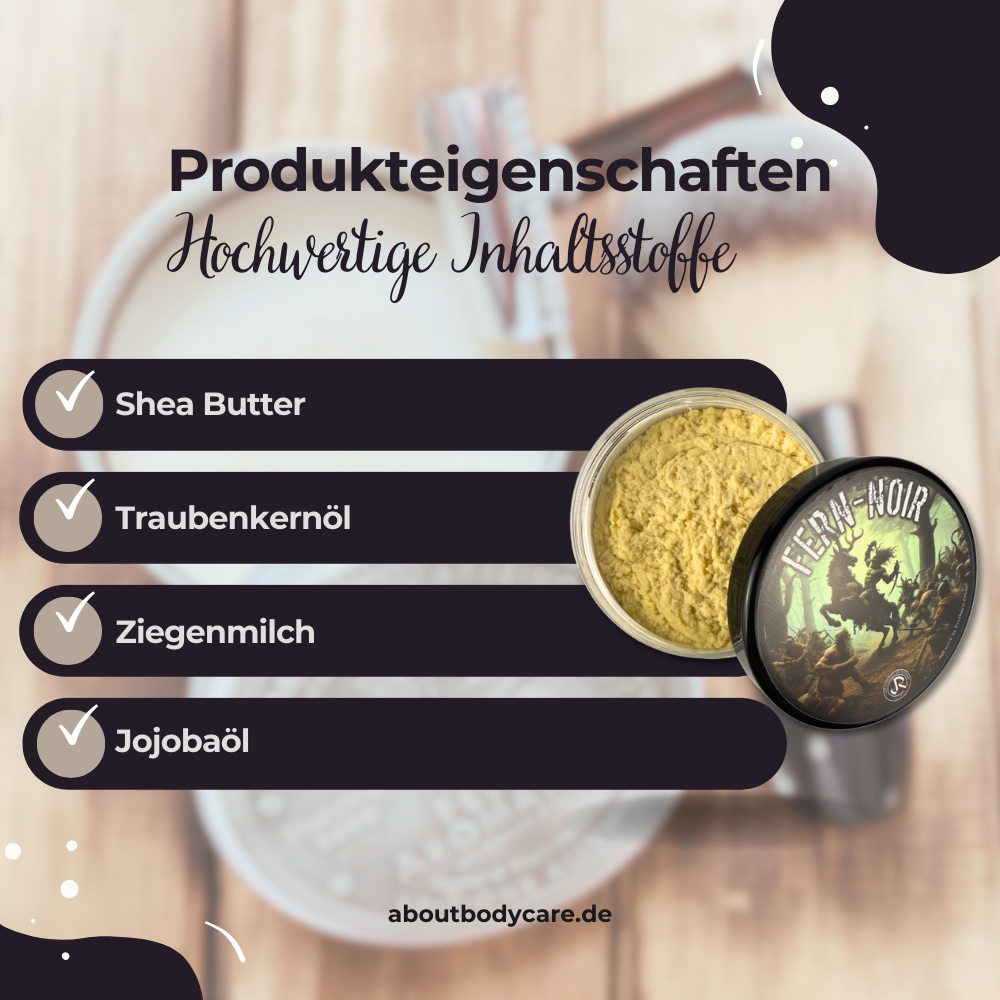 Die Rasierseife Fern Noir enthält Sheabutter, Kokosöl, Olivenöl, Jojobaöl, Reiskeimöl, Traubenkernöl, Avocadoöl und frische Ziegenmilch. Diese hochwertigen Zutaten unterstützen die Hautpflege, liefern Feuchtigkeit und sorgen für dichten, cremigen Schaum. Zudem helfen Lanolin und Honig, die Haut geschmeidig zu halten.