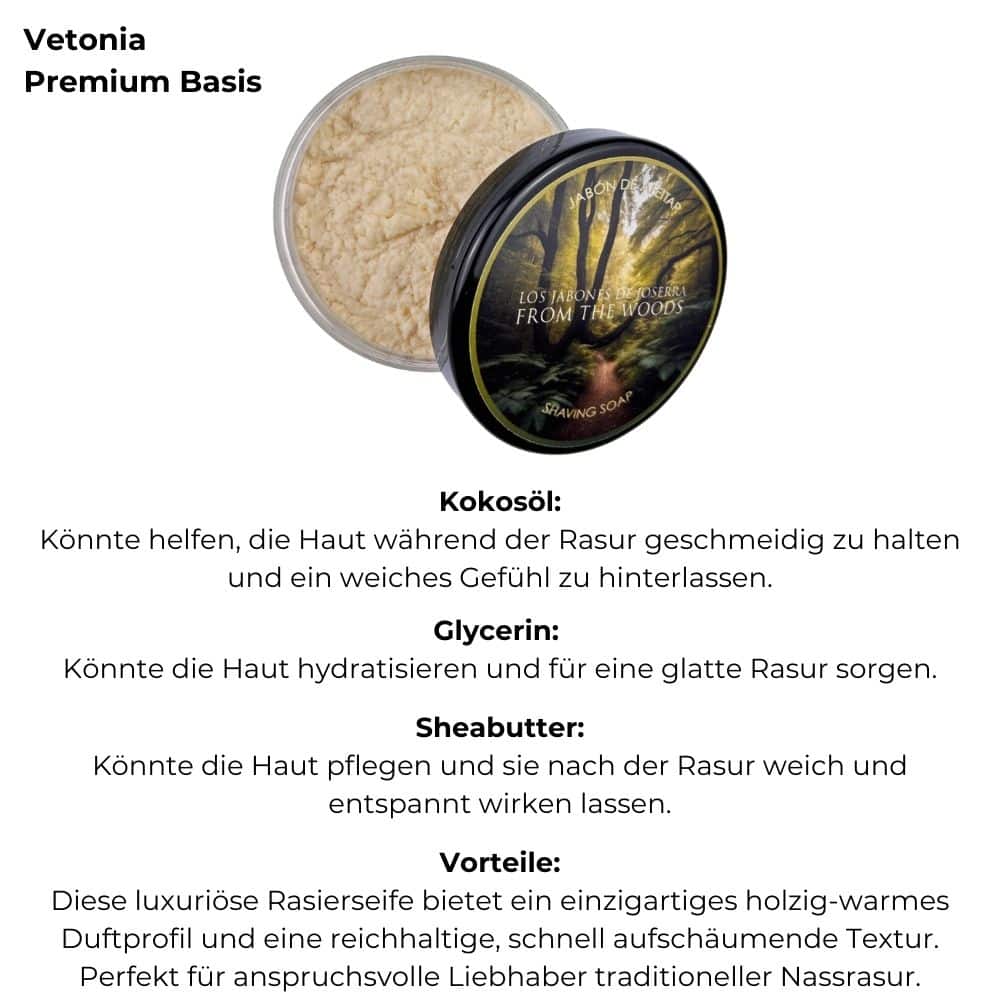 Die Los Jabones de Joserra Rasierseife From The Woods ist eine sorgfältig entwickelte Mischung aus natürlichen Inhaltsstoffen, die jede Rasur zu einem Erlebnis machen. Rindertalg und Stearinsäure liefern die Basis für einen dichten, stabilen Schaum, der deine Klinge sanft über die Haut gleiten lässt. Kokumöl und Jojobaöl pflegen die Haut und bewahren sie vor Trockenheit, während Lanolin und Glycerin für eine angenehme Feuchtigkeit sorgen. Diese Kombination sorgt dafür, dass deine Haut sich nach der Rasur erfrischt und geschmeidig anfühlt.