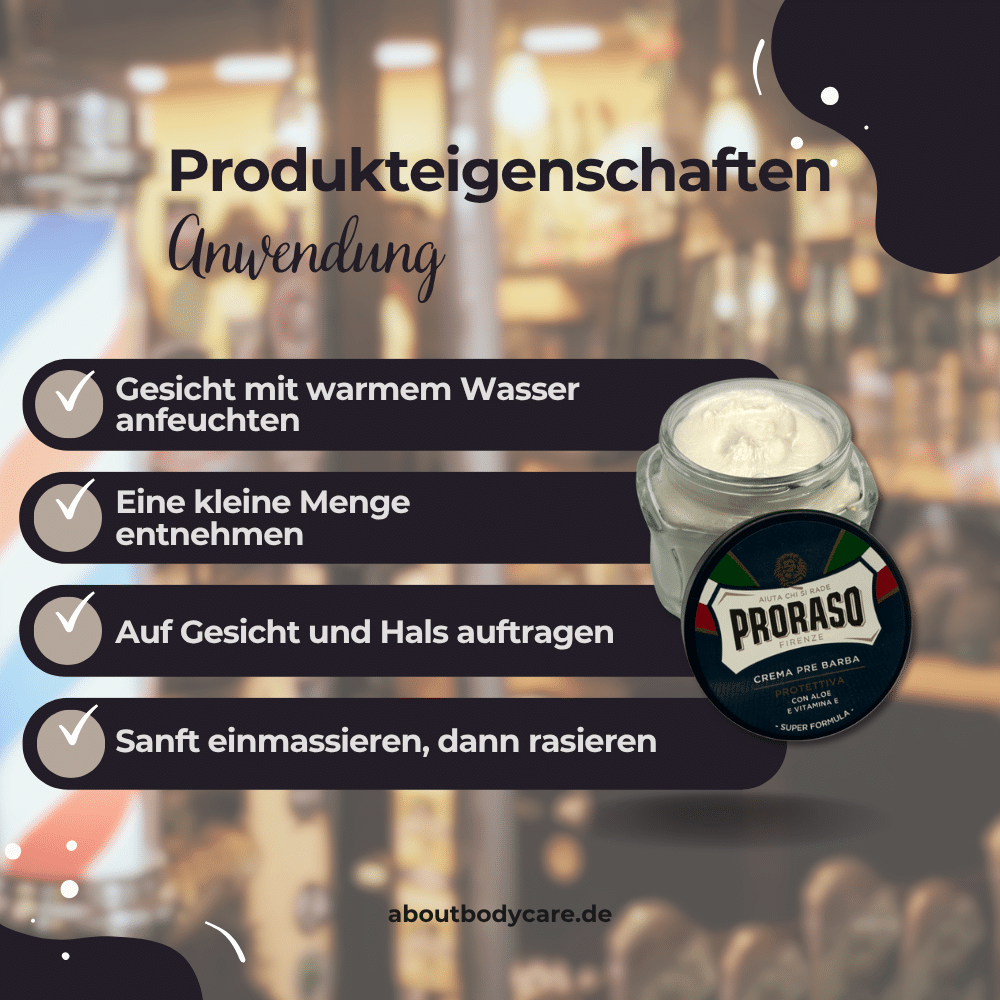 Für eine optimale Rasurvorbereitung befeuchte dein Gesicht mit warmem Wasser. Trage dann eine kleine Menge der Pre Shave Blue Line auf und massiere die Creme mit sanften, kreisenden Bewegungen in die Haut ein. Achte darauf, die Creme gleichmäßig zu verteilen, um das Barthaar zu erweichen und die Haut zu schützen.
