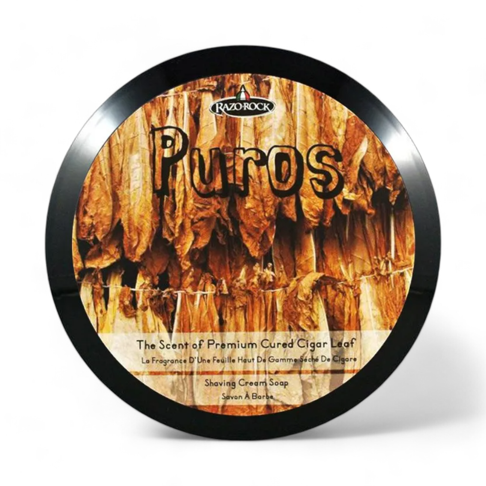 Die handgefertigte RazoRock Rasierseife Puros bietet ein maskulines Erlebnis mit einem unvergleichlichen Tabak- und Moschusduft. Hergestellt nach einem alten italienischen Rezept auf Talgbasis, sorgt sie für eine reichhaltige und pflegende Rasur. Ein Must-Have für Tabak-Fans.