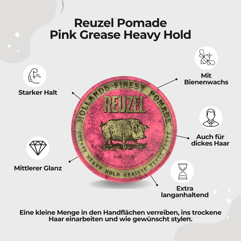 - 1x Reuzel Pomade Pink Grease Heavy Hold 113g, Bienenwachsbasiert