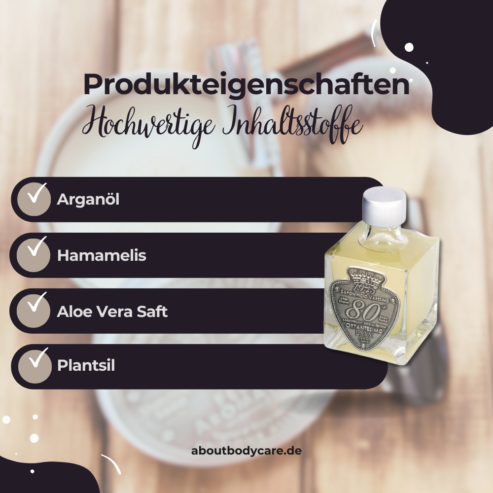 Der After Shave Balsam 80th Anniversary enthält pflegendes Arganöl, beruhigendes Kamillenblütenwasser und Aloe Vera. Balanites-Samenöl und Hamamelis-Extrakt schützen die Haut, während Vitamin E antioxidativ wirkt. Patchouli-, Zedernholz- und Lavendelöl sorgen für eine beruhigende Wirkung und einen angenehmen Duft.