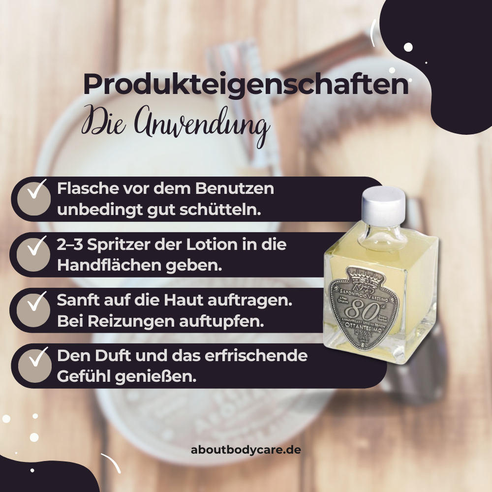 Trage den After Shave Balsam 80th Anniversary direkt nach der Rasur auf die noch leicht feuchte Haut auf. Eine kleine Menge in die Handfläche geben und sanft einmassieren. Vermeide kräftiges Reiben, besonders bei irritierter Haut. Die Haut wird beruhigt und mit Feuchtigkeit versorgt.