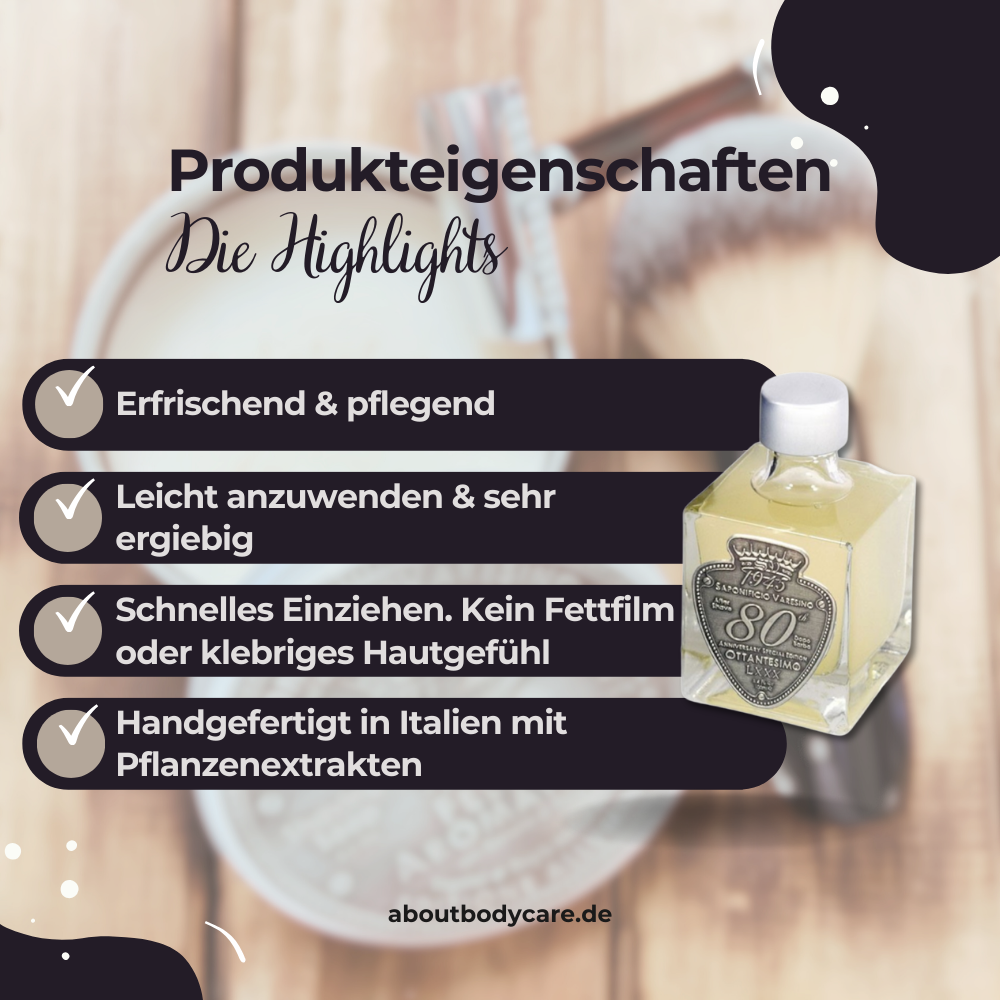 Der After Shave Balsam 80th Anniversary ist mehr als nur ein Aftershave – er bietet ein luxuriöses und unvergleichliches Pflegeerlebnis. Mit feuchtigkeitsspendenden und beruhigenden Inhaltsstoffen sorgt er für eine sanfte, erfrischende und wohltuende Rasurpflege. Ein Must-Have für jedes Badezimmer