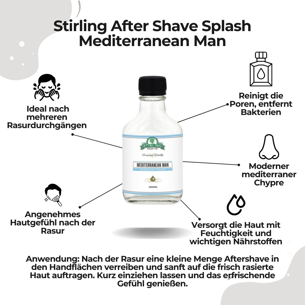 Das alkoholbasierte Splash sorgt für ein klassisches Rasurgefühl und hinterlässt ein sauberes, belebtes Hautbild. In Kombination mit der Rasierseife Mediterranean Man entsteht eine stimmige Duftlinie für eine durchgängige, klare Pflegeroutine.