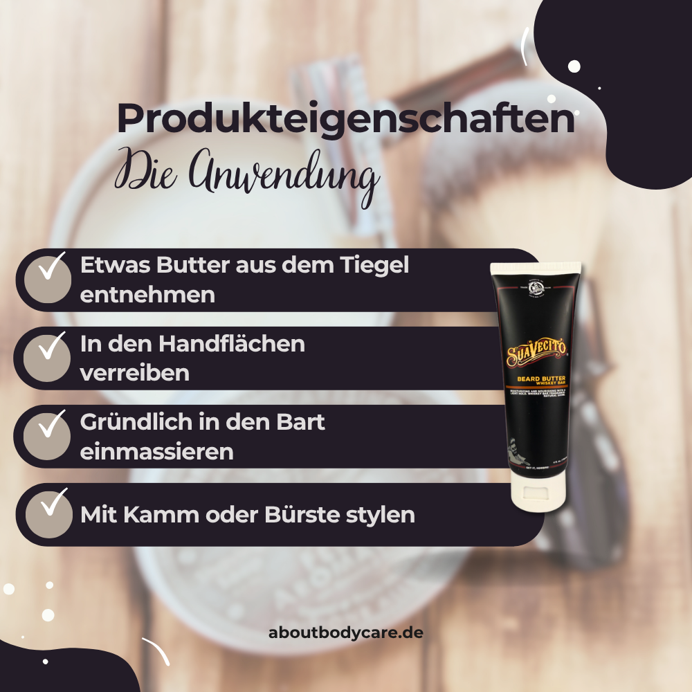 Nimm eine kleine Menge Bartbalsam in die Handflächen, verreibe sie kurz und massiere den Balsam dann gründlich in deinen Bart ein – von der Haut bis in die Spitzen. Ein Bartkamm oder eine Bürste hilft dabei, das Produkt gleichmäßig zu verteilen und den Bart anschließend in Form zu bringen. Die Anwendung funktioniert am besten nach dem Duschen oder auf leicht feuchtem Bart.