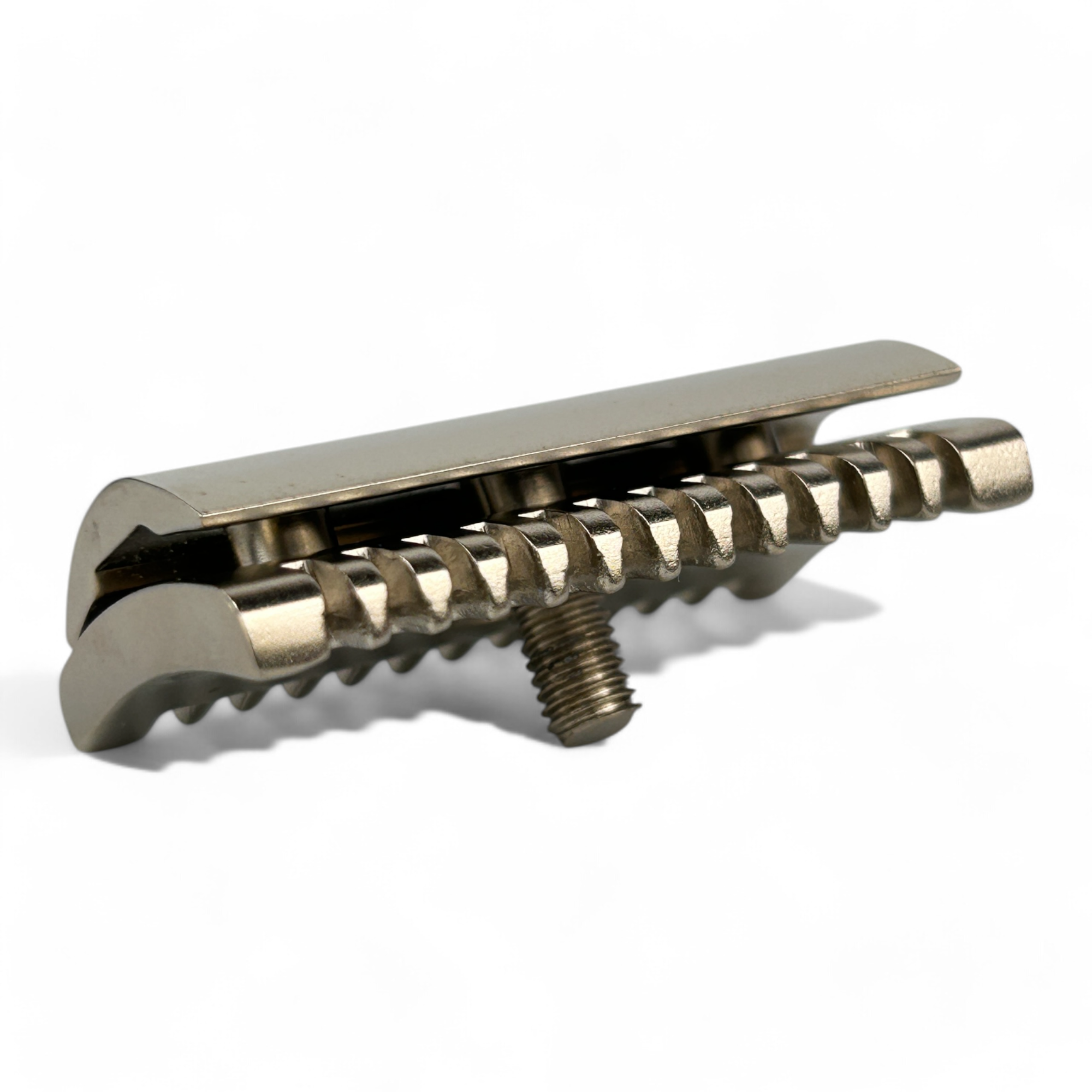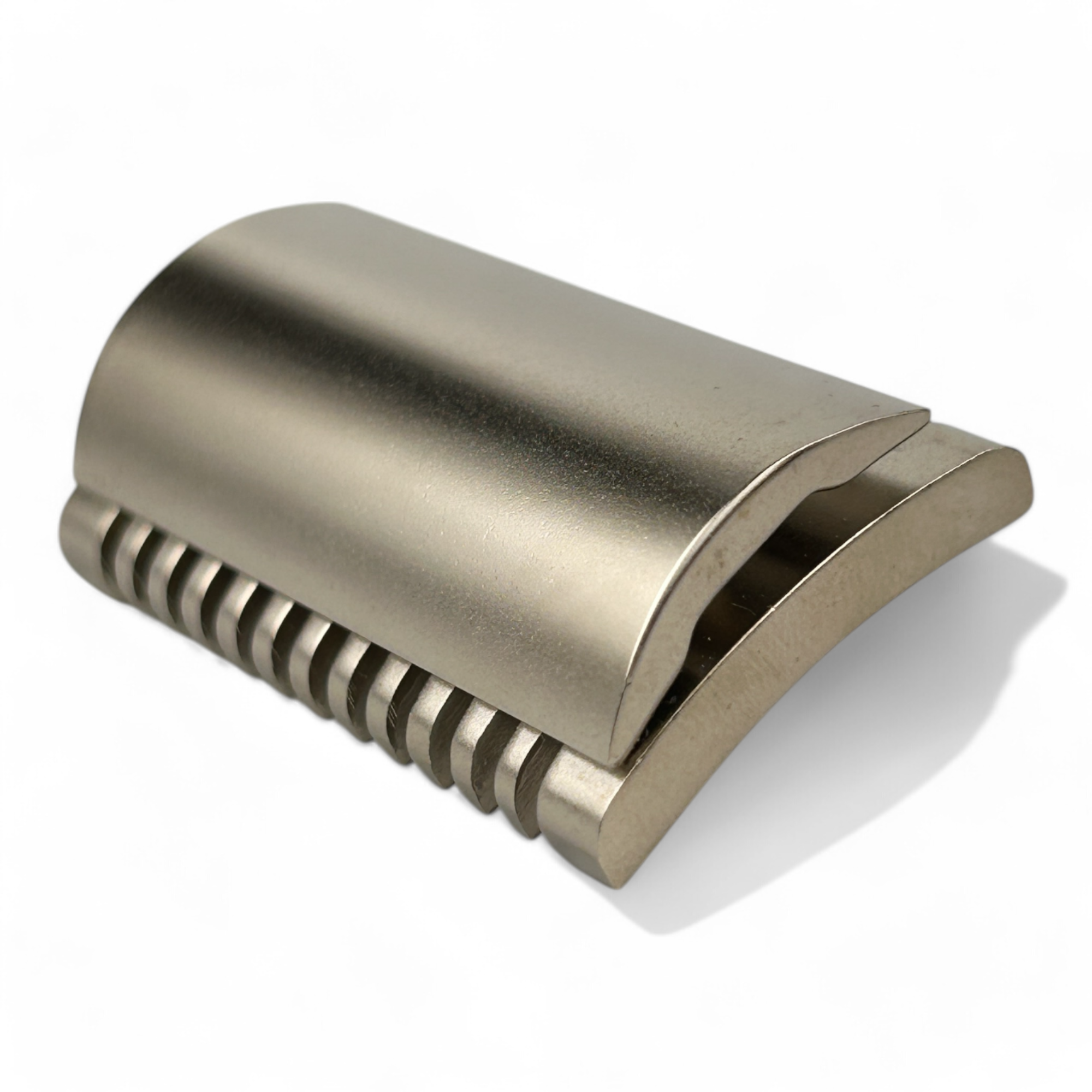 Gefertigt aus satiniertem Zamak-Druckguss, überzeugt die Kopfplatte nicht nur durch ihre elegante Optik, sondern auch durch ihre Langlebigkeit. Zamak ist eine spezielle Legierung, die aus Zink, Aluminium, Magnesium und Kupfer besteht. Diese Materialmischung verleiht der Kopfplatte ihre bemerkenswerte Robustheit und Widerstandsfähigkeit. Die satinierte Oberfläche trägt nicht nur zur ästhetischen Erscheinung bei, sondern schützt auch vor Korrosion und Abnutzung. Mit einem Gewicht von 37g bietet die Kopfplatte eine ideale Balance, die Dir hilft, präzise und komfortabel zu rasieren.