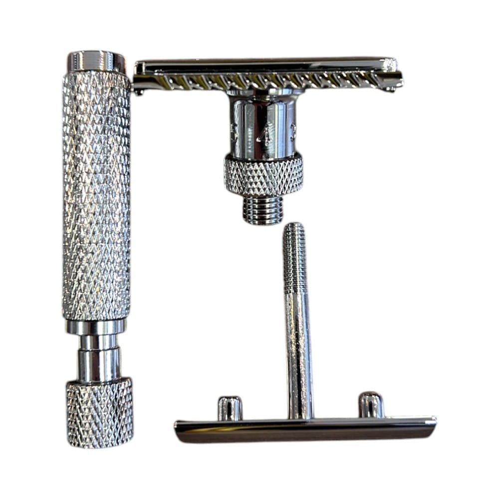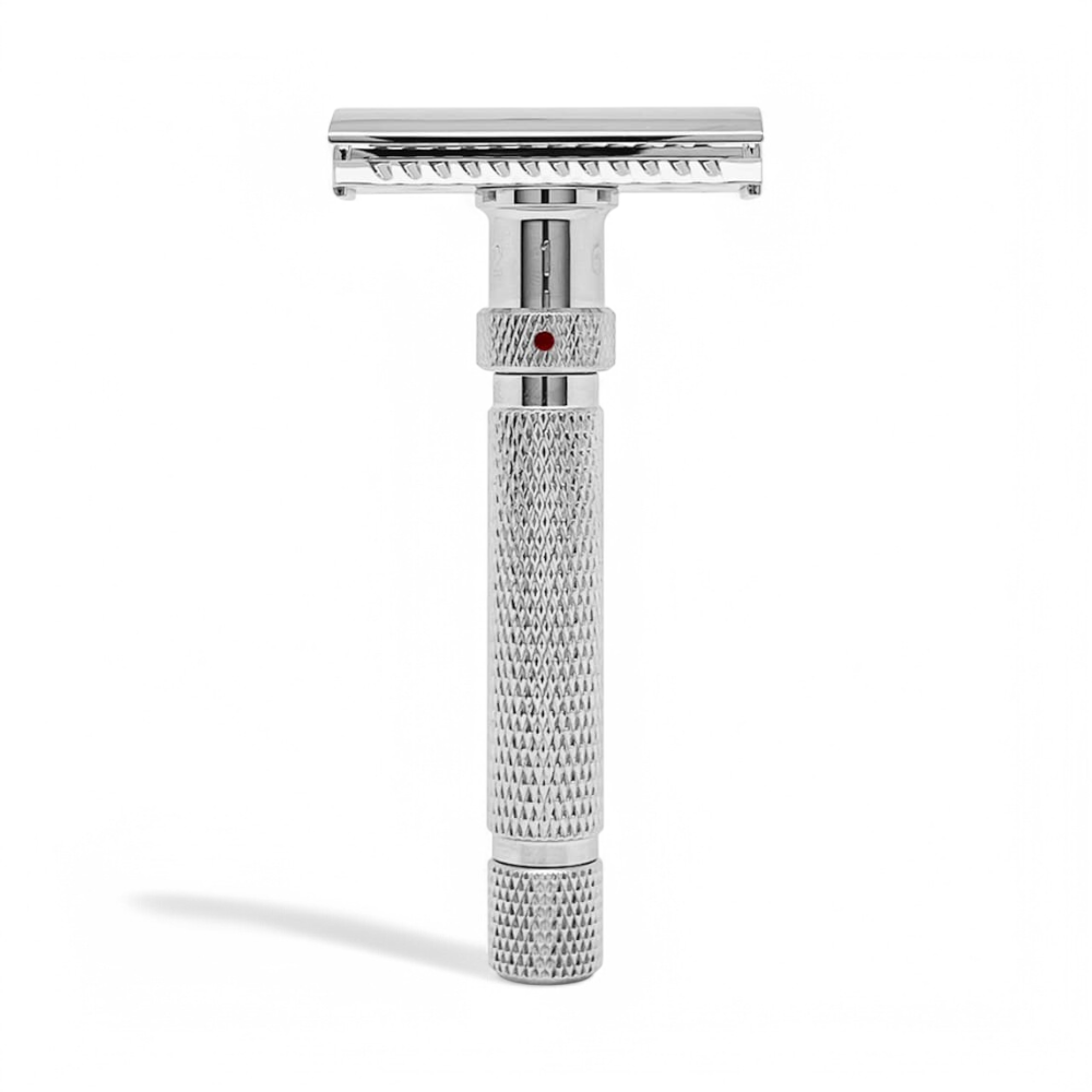 Mit seinem hochwertigen Messing- und Zamak-Korpus, veredelt durch eine glänzende Chrombeschichtung, liegt der Rasierhobel Blazer perfekt in der Hand und sorgt für ein müheloses Gleiten über die Haut. Das Besondere? Sechs individuell einstellbare Stufen, mit denen du die Aggressivität des Klingenspalts nach deinen Bedürfnissen anpassen kannst.